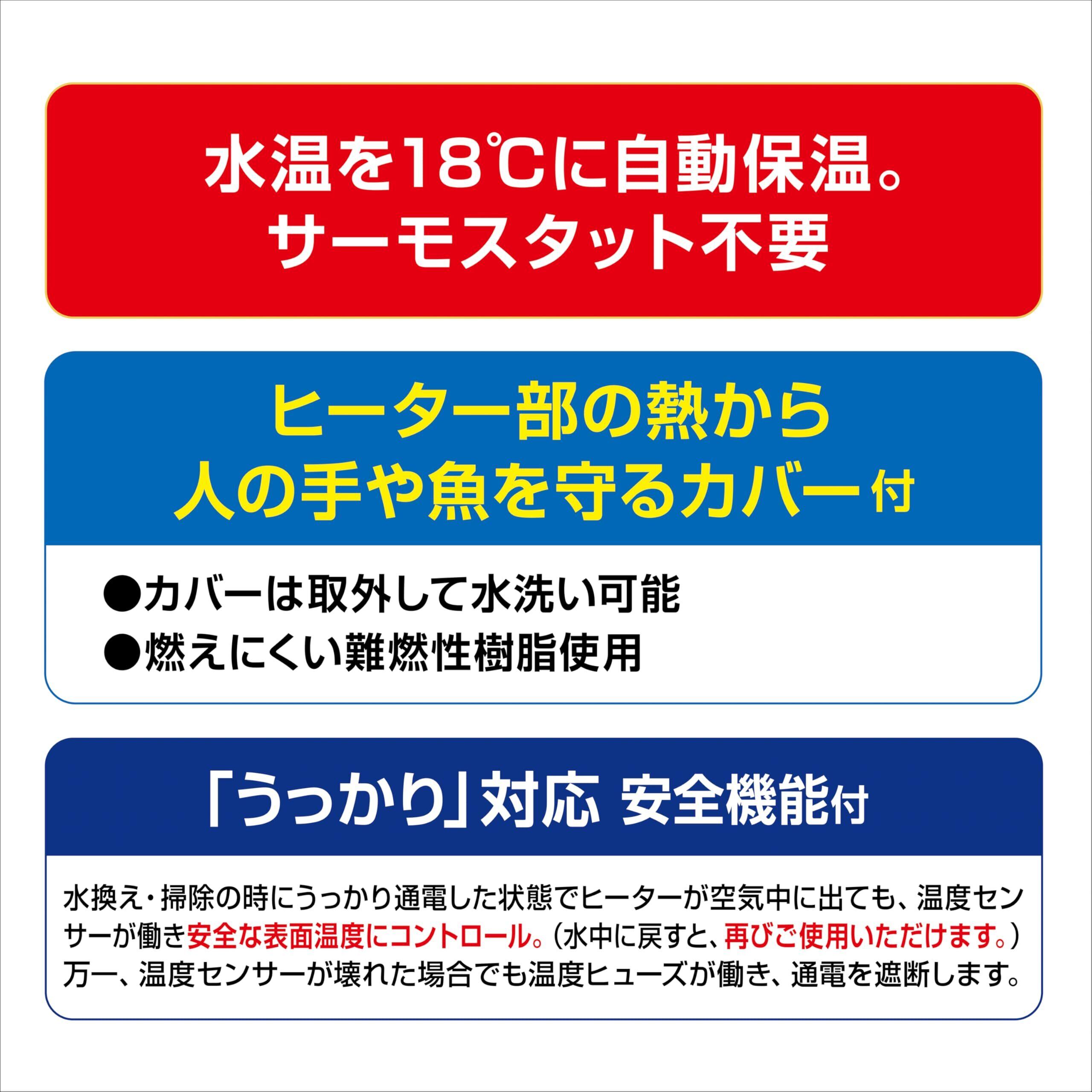 金魚が快適に過ごせる18度(±5度)に自動保温する温度固定式ヒーター(サーモスタット不要)。 金魚を熱から守るヒーターカバー付なので安心して使える。 ・縦設置でも、正確に水温をコントロールする独自設計。縦・横自由にレイアウトできるから、水槽内がスッキリ。 ・ヒーター管を2段にすることでコンパクト化。 ・トラッキング対応プラグ使用。※熱帯魚用ヒーター安全対策協議会「SH規格」適合品 安全を追求した独自の構造。 ヒーター部と水温センサー部を並列に設計したので、ヒーター部の加温によるセンサー誤動作がなく、水槽内で縦設置が可能(横設置もOK)。 うっかり通電した状態でヒーターが空気中に出ても、温度センサーが働き安全な表面温度にコントロール。(水中に戻すと再びご使用いただけます。) 万一、温度センサーが壊れた場合でも温度ヒューズが働き、通電を遮断します。 ヒーター部の熱から人の手や魚を守るカバー付。難燃性樹脂を使用したヒーターカバーがついているので、人にも、魚にも安全です。※ヒーターカバーには米国の難燃性試験規格である「UL94」のV-0グレード適合樹脂を採用。 昼夜の水温が大きい季節は、金魚が体調を崩しやすくなるため、ヒーターで金魚が快適な水温に保温する必要があります。金魚元気オートヒーターは省エネにも配慮しながら、金魚が病気にかかりにくく、エサをよく食べる水温18度に保温するので、季節を問わずに元気に泳ぐ金魚の姿を楽しむことが出来ます。 適合水槽:水容量約60Lまでの中型水槽 ヒーターサイズ:幅5.3×長さ14.4×高さ4.2cm 電源コード:約0.9m 定格消費電力:120W