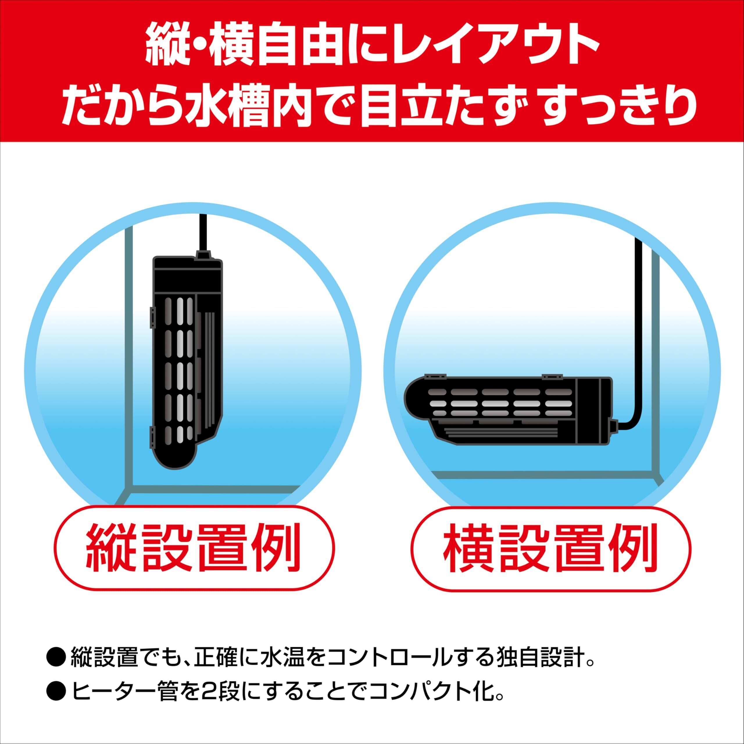 ■縦横設置可能でレイアウト自在!■このオートヒーターは、縦横どちらでも設置可能。水槽のデザインやレイアウトに合わせて最適な配置ができるため、場所を選びません。また、スリムなデザインで、すっきりとした外観を保ちながら機能的な暖房を実現します。