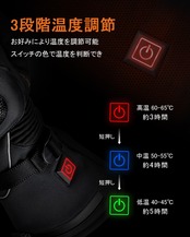 【3段階の温度調節機能で最適な暖かさを!】温度は3段階に調節が可能で、自分の好みに合わせて快適な温かさを実現。タッチパネルで簡単に操作でき、手袋を着けたままでもスムーズに設定が行えます。