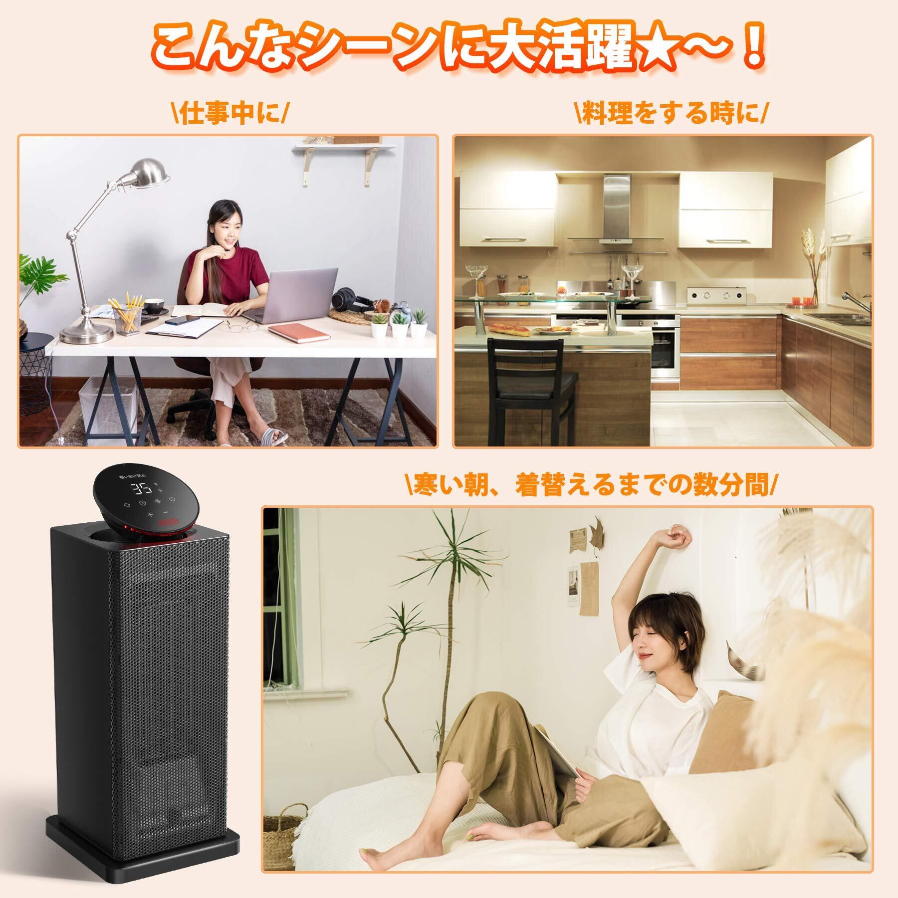 【寝ながらも操作出来・今冬に不可欠な多機能型ヒーター】 本部屋ヒーターは特大号のPTCセラミックが搭載され、高電熱転換率で即時に空気を加熱し、周りはしばらくの間に暖まります。お部屋の空気を汚れず、石油ヒーターより即効で温風を吹き出しニーズにより局部的なところへの暖房はできます。リモコン付いて枕元に置いておくと寝ながらもヒーターを制御し、今冬はより便利な高品質生活を楽しみます!強・弱・送風の出力モードがあり、「冬場に速暖暖房、夏場に空気循環」を実現する一挙両得の多機能型ヒーターです。