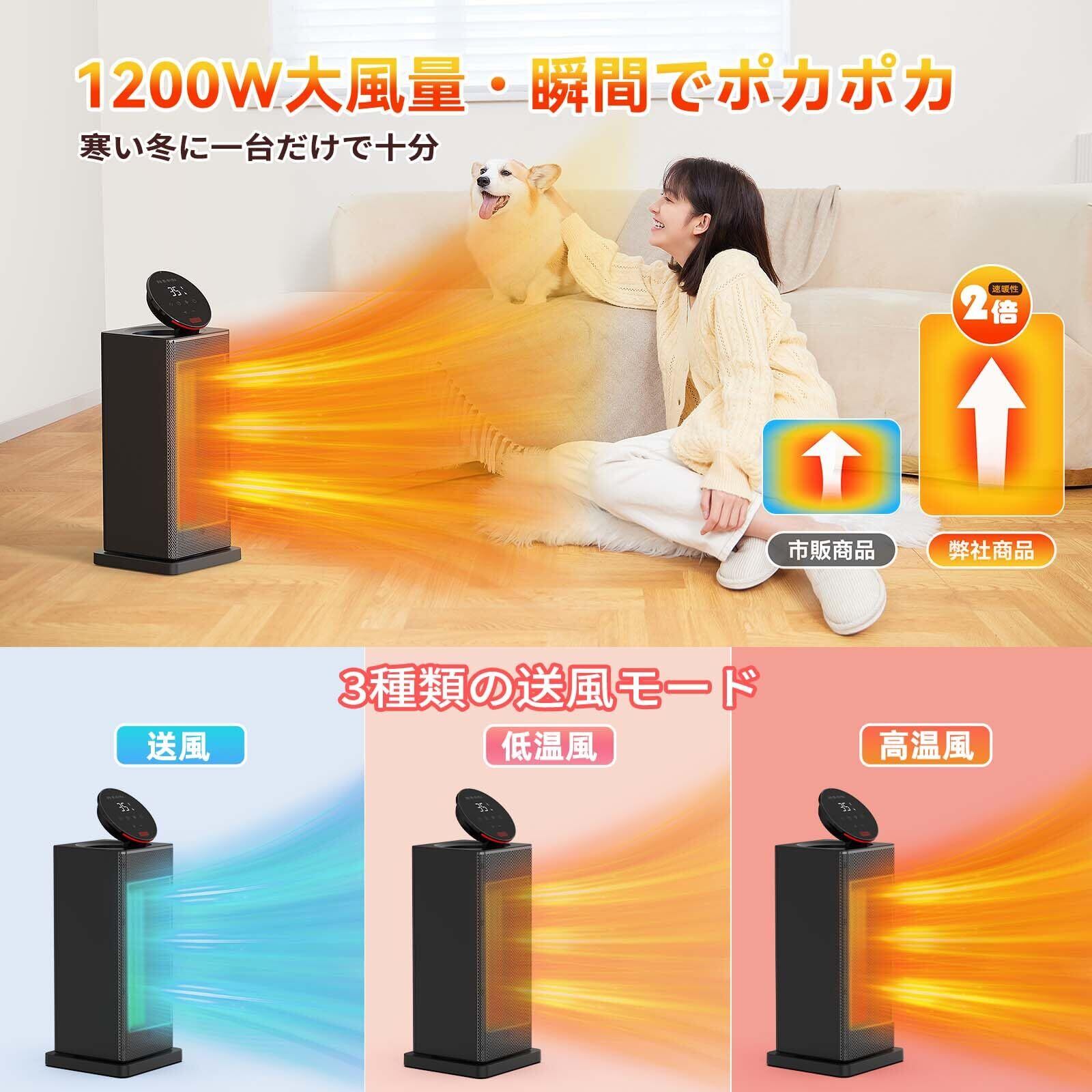 BREEZOMEヒーター セラミックヒーター 1200W電気ファンヒーター 小型 24Hタイマー 速暖 温度調節可能 自動首振り 3段階風量 LED大型ディスプレ 暖房器具 省エネ 記憶機能 リモコン付き 四季適用 冷暖両用 過熱保護 転倒自動OFF コンパクト 足元ヒーター 温風ヒーター 脱衣所 寝室 ブラック PSE認証済