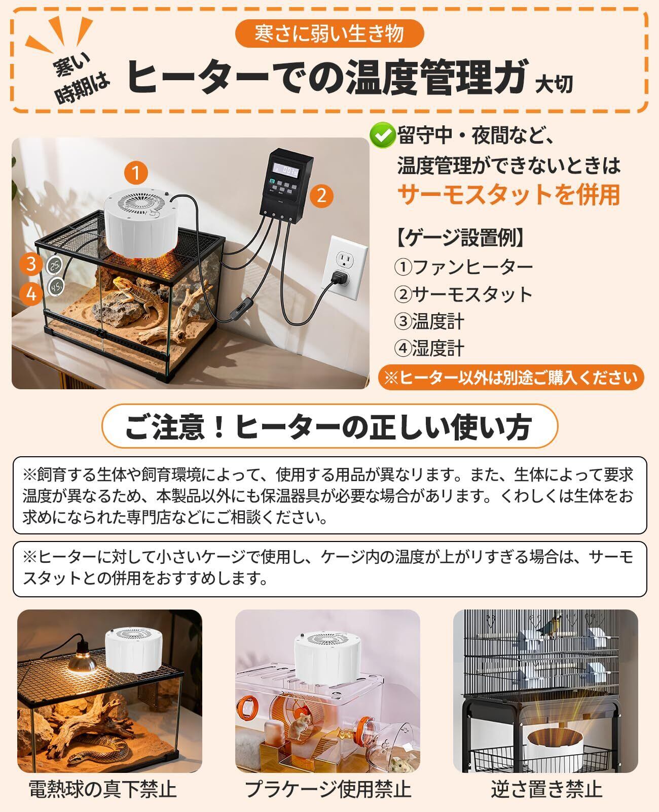 【温風と送風を同時搭載した爬虫類ヒーター】TENKOO&YOUの大人気爬虫類・小動物専用ヒーターが今夏、日本に登場!コンパクトなボディに温風と送風の2機能を備えた一台で、春夏秋冬を通じてペットの快適環境をサポート。夏は涼やかな微風でケージ内のこもった熱を逃がし、冬は温風で素早く均一に加温。一年中、愛するペットに理想的な微小気候を提供します。(注:ケージは密閉構造です)