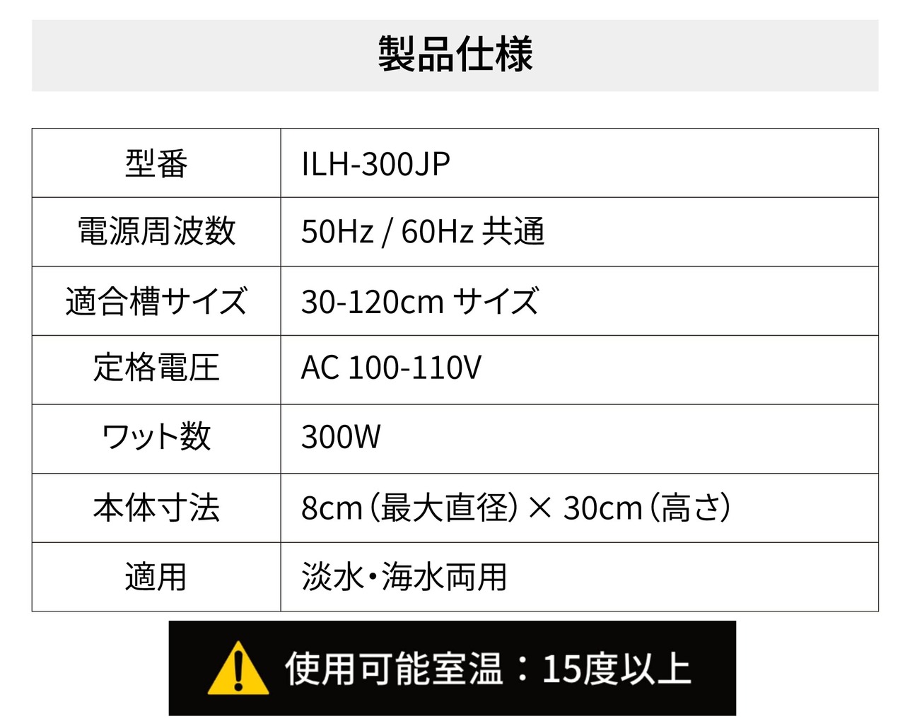 レイアウトがスッキリ!100V 50/60Hz 水槽 淡水・海水両用 300W外部式ヒーター 温度センサとマイクロコンピュータ制御によって高精度に温度をコントロールする、外部フィルター用のインラインヒーターです。 国内初の完全な日本向け仕様で、厳格な安全性検査を実施しているPSE認証適合品です。 ※ご注意!:使用可能室温:15度以上。過加温に繋がりますので著しく低い室温で使用しないでください。また、パッキンの付け方に不備があると水漏れが生じる可能性があります。説明書をよくお読みになり、正しくパッキンをご装着ください。