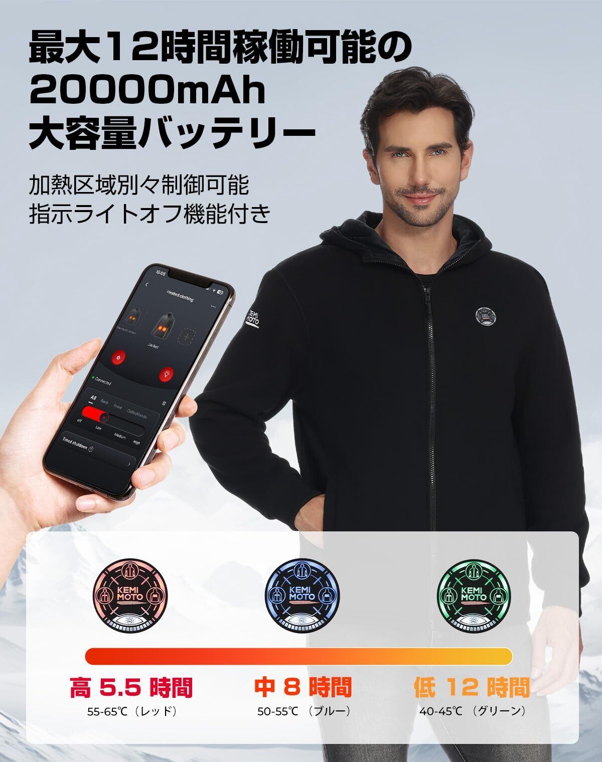 [KEMIMOTO] バイク 電熱ジャケット 電熱ウェア TypeC充電・USB給電 6箇所発熱&1速暖12V出力20000mAhバッテリー付き 電熱服 ヒータージャケット フード付き 3段階温度調節 洗濯可 メンズ レディース 長袖