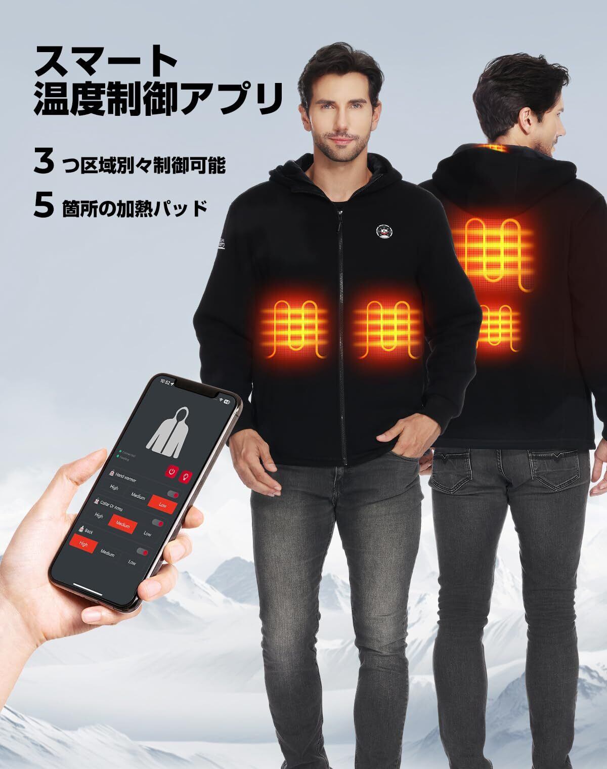【高機能・アプリで温度調節】KEMIMOTO2025年新型電熱ジャケットは、スマホアプリで温度調整機能を追加します!QRコードをスキャンして、スマホでブルートゥースをオンにして、電熱ジャケットのブルートゥース信号と接続すれば、スマホで温度や発熱箇所を調整できます。(①高温(55-65°C)、中温(50-55°C)、低温(40-50°C)の3つのモードを切り替え可能です。)ジャケットとバッテリーに繋がるケーブルはタイプ CとDC両タイプを設計され、ほとんどのモバイルバッテリーに適用し、お手持ちのバッテリーも繋がられます。(より良い体験のため、12V出力のバッテリーをご使用ください。)
