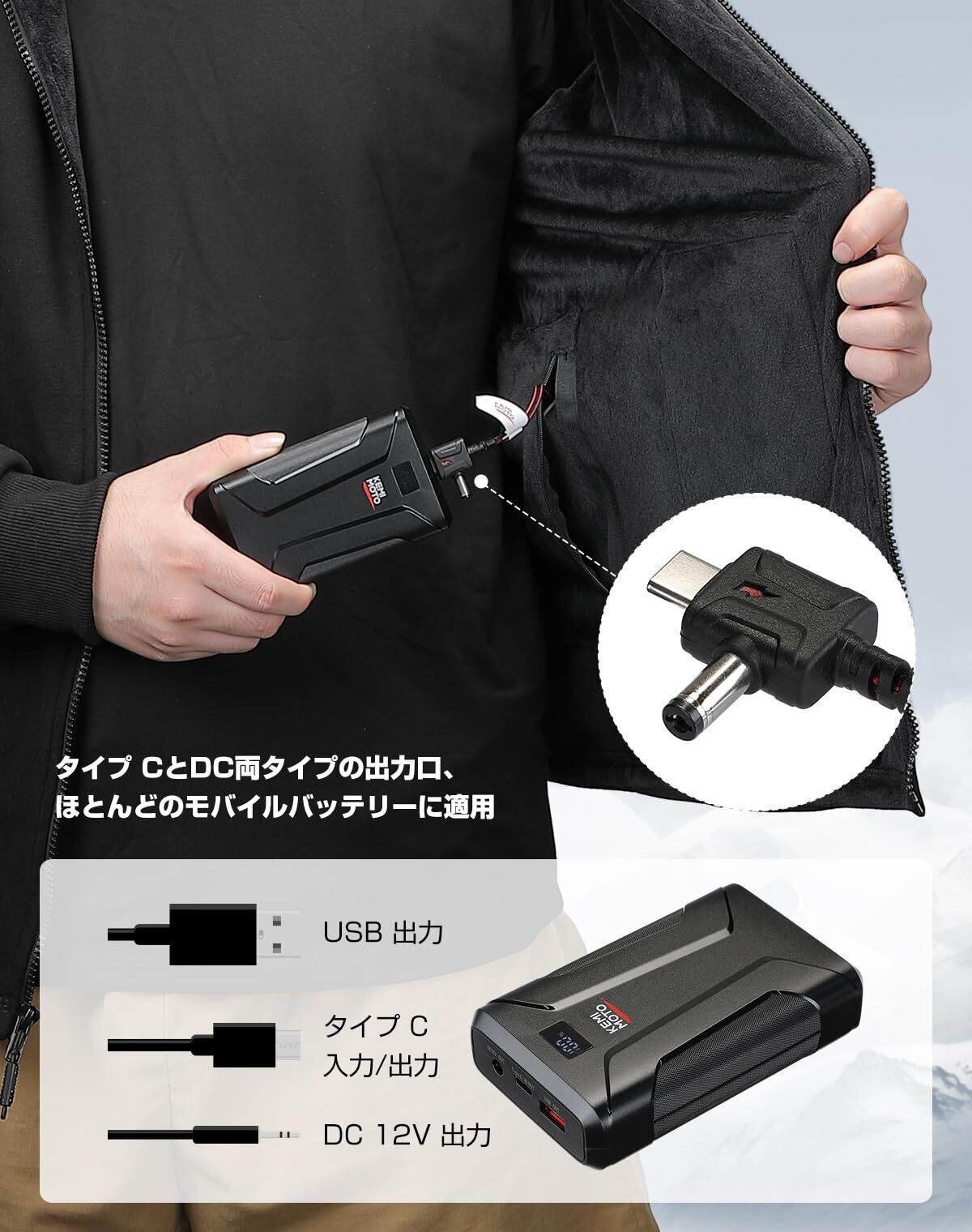 【10秒急速発熱&一日中稼働】KEMIMOTOのヒータージャケットは、12V高出力/20000mAh大容量のモバイルバッテリーが付属しており、従来品と違って、わずか数秒で素早く加熱できます。加熱温度によって使用時間は約6〜12時間になります、1日中かかる使用のニーズに十分対応できます。更に、急速充電の充電器も搭載し、フル充電は僅か4時間だけです。USBケーブルを使って、この大容量バッテリーはスマホも充電できます。