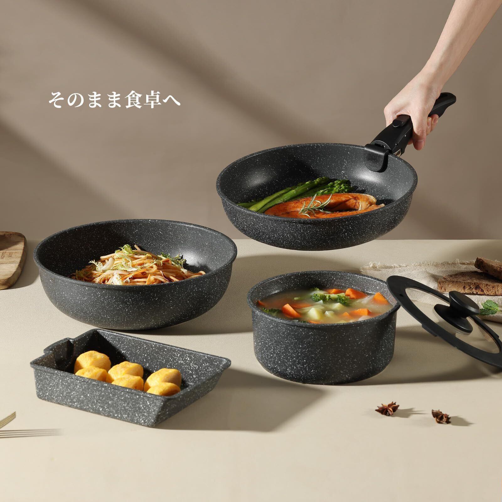 【軽量設計で扱いやすさ抜群】このフライパンセットは軽量で、扱いやすさを追求した設計となっています。取っ手が取り外せるため、収納も簡単で、省スペースでの管理が可能です。オーブンにも対応しているため、幅広いレパートリーに対応できます。