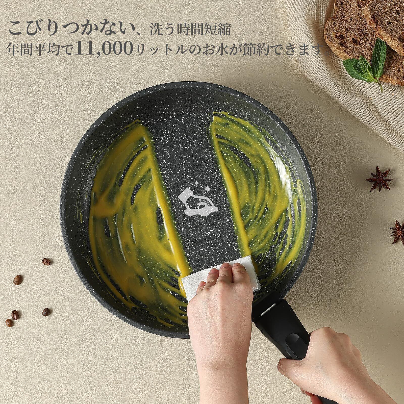 ■スルスルすべるマーブルコート!■特別な5層構造のマーブルコートが高い耐久性とくっつきにくさを実現。食材がスルスルと滑る感触は、調理を楽しくスピーディにします。毎日の料理がストレスフリーになること間違いなしです。