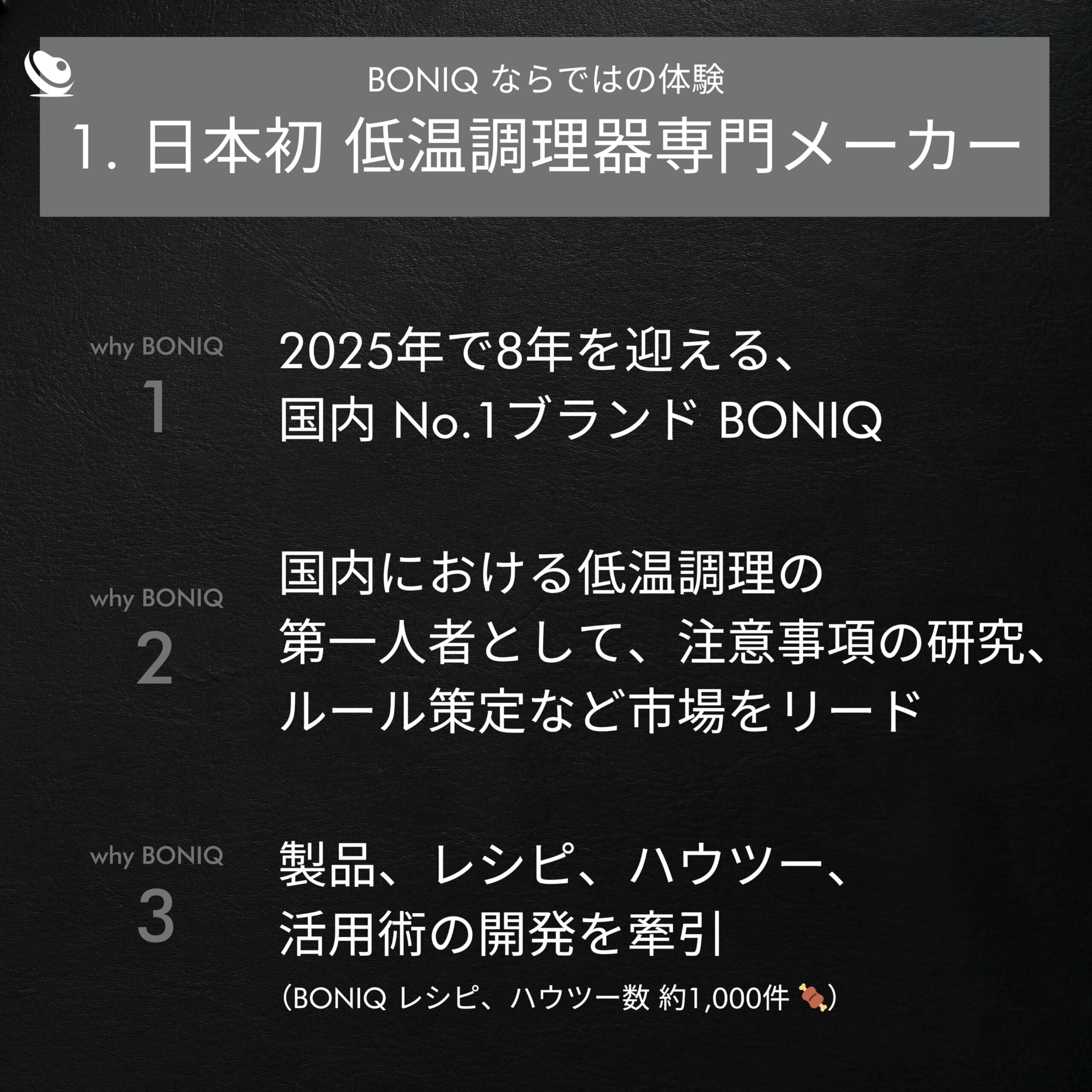 【BONIQが選ばれる理由✨】2025年で8年を迎える、国内No.1ブランド。国内における低温調理の第一人者として、製品、レシピ、ハウツーの開発を牽引しています。(国内最大級 低温調理レシピサイト運営。)安全面、性能、外観、カスタマーサポート体制、そのすべてに一切の妥協を許さない、ものづくり。そして、BONIQでは「買っていただいてからが、始まり」。楽だから。おいしいから。と使っているだけで“ヘルシーな食習慣”を叶えてくれる「低温調理のある暮らし」を提供しています。BONIQの真のテーマは、日本人の食習慣向上です。