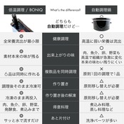 【低温調理のメリット】おいしい:食材ごとに適した温度で加熱するから、鶏むね肉もローストビーフもチャーシューも、魚介、野菜、卵、発酵食品、スイーツ、ドリンクまで!いつもの食材をグッとおいしく。簡単:袋&BONIQに投入するだけだから、料理苦手でも大丈夫!簡単だからずっと続けられる。効率化/時短:ほったらかし調理&量産&作り置きのメリットを享受して、ゆとり時間。栄養価:程温度帯&袋での調理だから、栄養素を逃しにくい。体にやさしい:素材の味を引き出すから、過度な調味料不要。体にもお財布にも優しい。洗い物が出ない:袋で完結するから、後片付け楽らく。