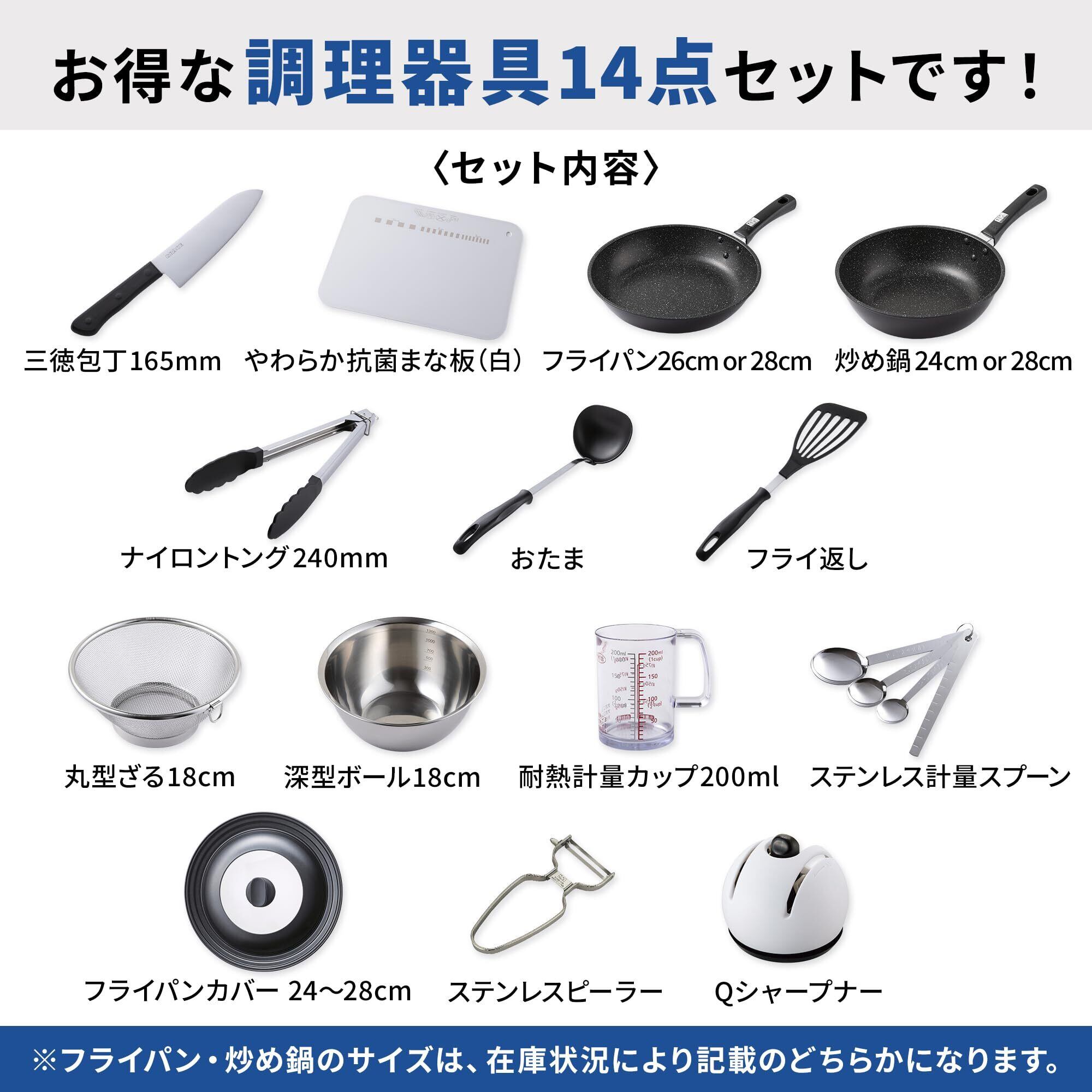 \たくさんのご要望にお応えして/ フライパンカバー・ピーラー・シャープナーを追加した 「14点セット」が新登場! 一人暮らしを始める方のためのスターターセット! 包丁やフライパンもセットになった料理道具14点セットです。 ご自宅用はもちろん、ご家族・ご友人への贈り物にもどうぞ