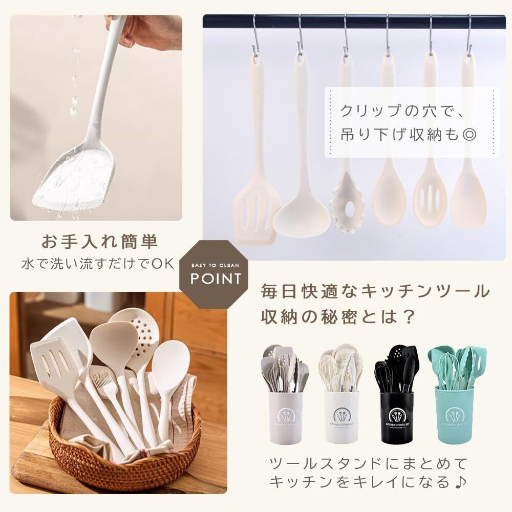 【安心使用】キッチンツールセット、食品級シリコンを採用して、ソフトで握りやすいし、抗菌で健康なキッチンツールで、安心にご利用できます。BPAフリー,有害物質BPAを含めません。高温の調理も安心ください。