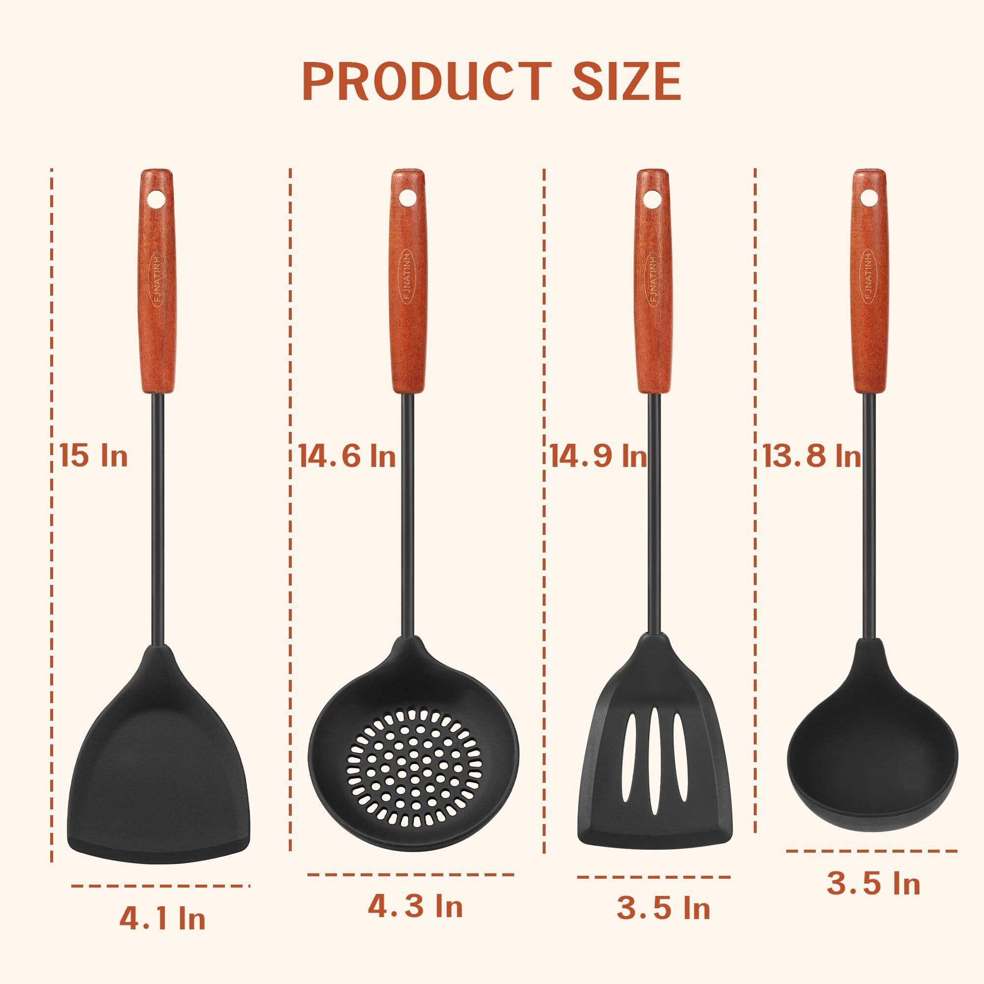 FJNATINHシリコーン中華鍋スパチュラ、溝付きスパチュラ、レードル、スキマーレードルツールセット、ノンスティック耐熱ステンレス鋼調理器具BPAフリーキッチン用品調理器具、4個入り、ブラック