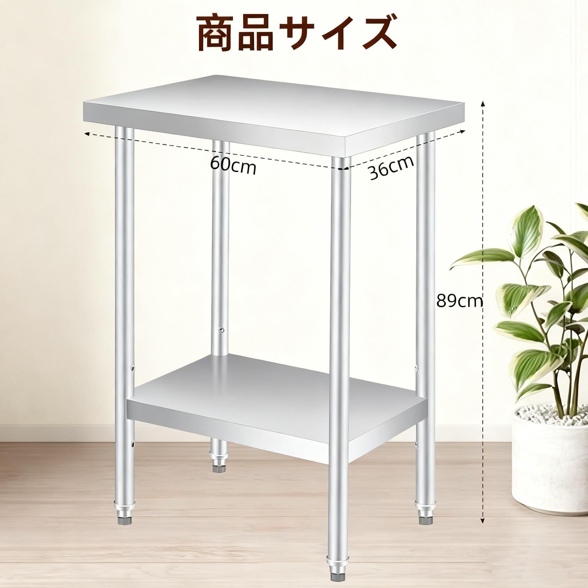 【業務用にも最適な頑丈な作業台!】この「Euker ステンレス作業台」は、飲食店や家庭用に最適な高品質な作業台です。サイズはW60×D36×H89cmで、2段の棚板は高さ調整が可能なので、さまざまな用途に対応できます。調理や準備の際に欠かせないアイテムです!