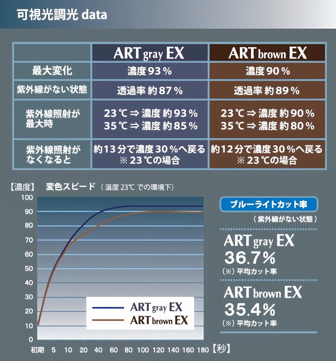 光の量でレンズの濃さが変わるものが可視光調光レンズです。屋内や夜間では薄いカラー(濃度約10%)車中では中程度のカラー(濃度約50%)屋外、晴天時では濃いカラー(濃度最大約90%)に変化します。さらにブルーライトカット機能も平均約35%カットあります。