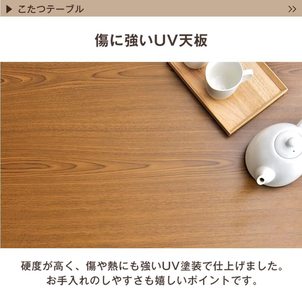 【あたたかさ溢れるナチュラルデザインのこたつテーブル!】幅120cm×奥行80cmの大きなサイズは、ご家族や友人と囲むのにぴったりです。木目の美しいUV塗装仕上げが、どんなインテリアにも馴染み、居心地の良い空間を演出します。