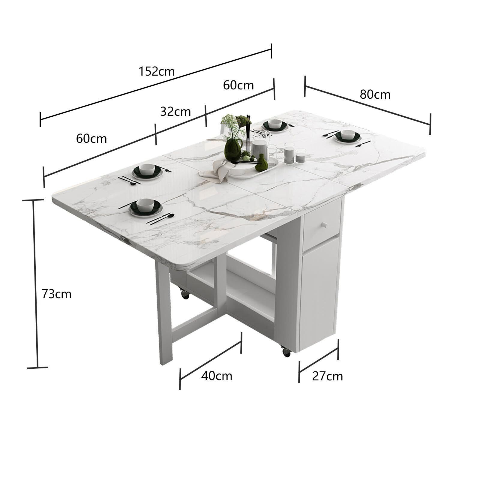 【省スペースダイニングテーブル】オープンサイズ:152 L x 80 W x 73 H(cm)。テーブルは折りたたんで戸棚にすることができ、マンションや洗練された戸型にぴったりです。伸縮可能なテーブルの中には、折りたたみ椅子や調理器具、飲み物などを1~4本収納できます。2つの引き出しはおやつや、ナプキンなどの日常用品の収納にも適します。