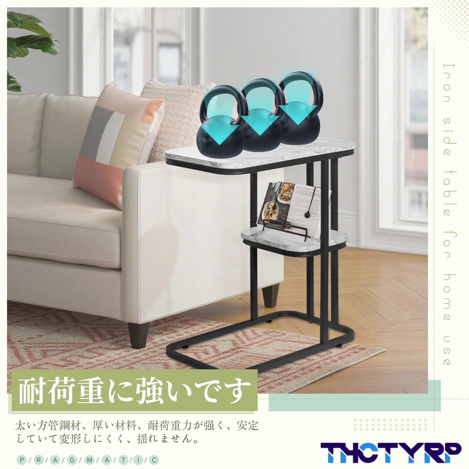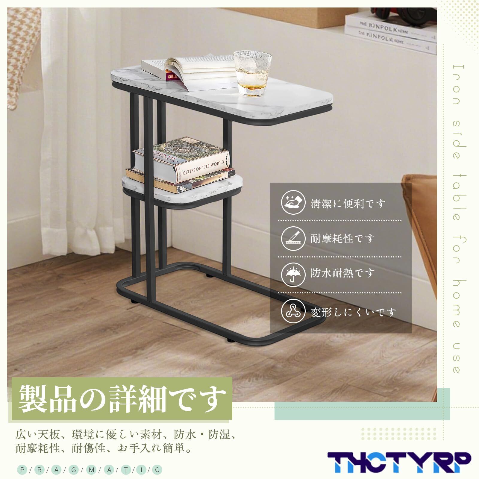 THCTYRP 【省スペースU型】ソファサイドテーブル ベッドサイドテーブル ナイトテーブル 大理石調 スリム 幅50cm x 奥行30cm x 高さ58cm 隙間収納 組立簡単 コの字型ラック 収納棚付き リビング 寝室用 おしゃれ(ホワイト+ブラック)