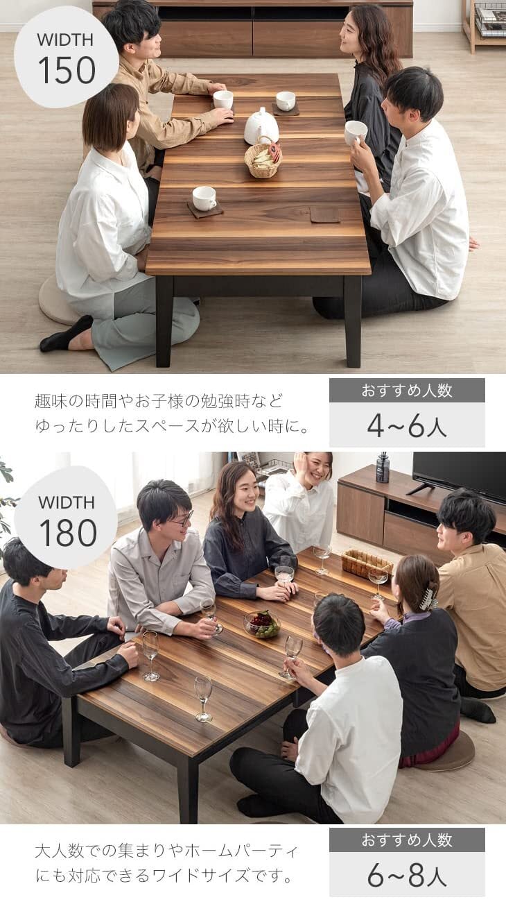 ■3段階のサイズ調整で便利!■幅120cm、150cm、180cmの3つのサイズに調整できることで、スペースに合わせて利用できます。友人や家族との集まりにも対応でき、急な来客時にも重宝します。また、テーブルを使わない時には、コンパクトにまとめて省スペースで収納可能です。