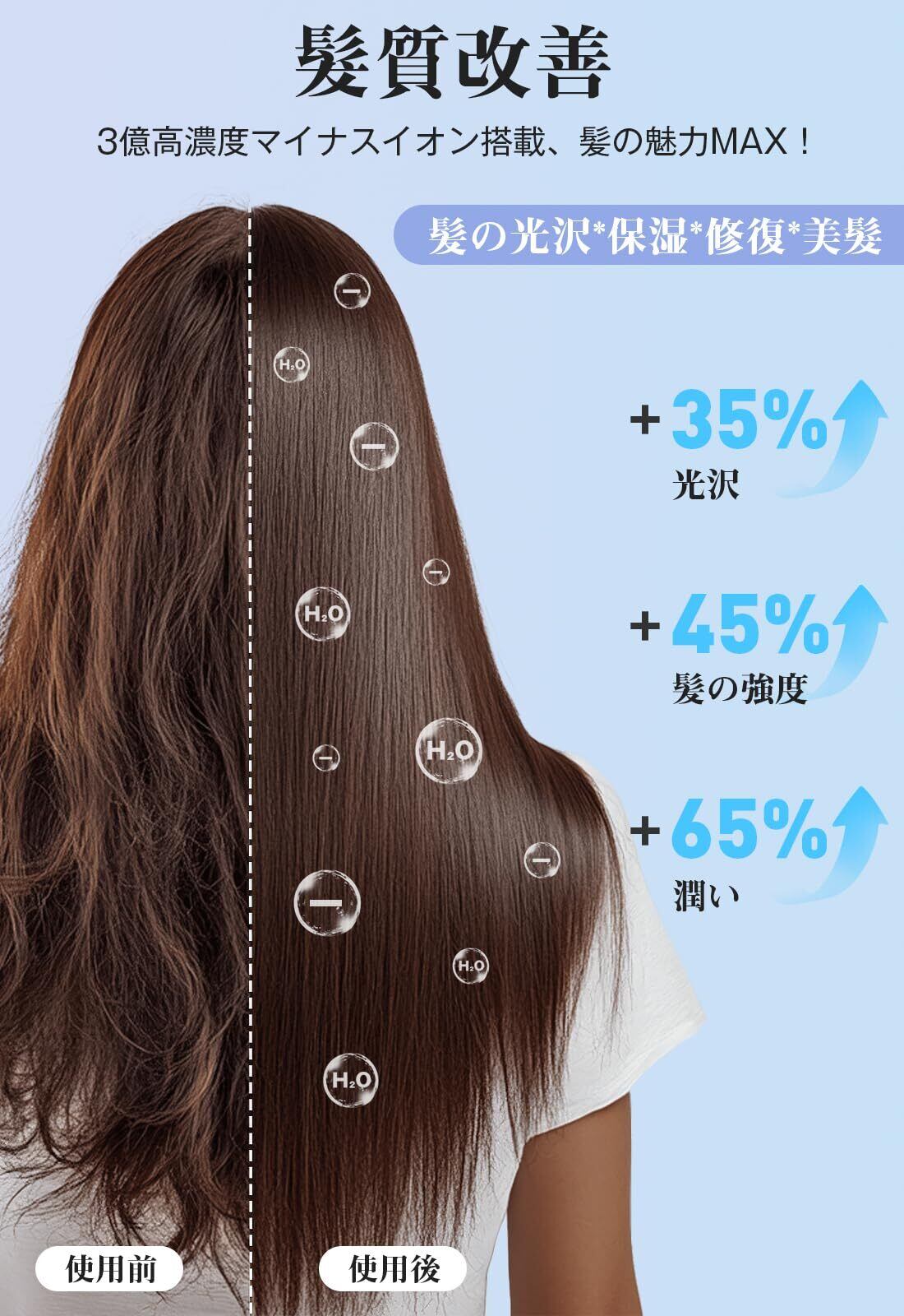【3億高濃度マイナスイオンでツヤとサラサラ感を徹底サポート】髪に自然な光沢と柔らかさを実現しましょう。このヘアドライヤーは、3億個の高濃度マイナスイオンを放出し、髪に潤いとツヤを与え、滑らかで柔らかな仕上がりを実現します。静電気を防ぎ、髪のうねりを抑えながら、シルクのような美しい髪へ導きます。さらに、簡単な操作でスタイリングも思い通りに。日常のヘアケアを格上げする必須アイテムです。