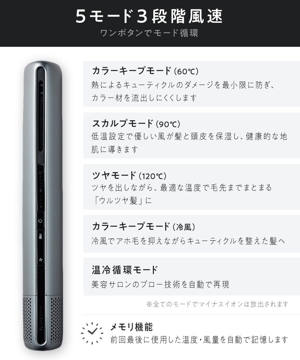 ■髪に優しい熱ダメージ軽減!■このドライヤーは、熱ではなく風量で髪を乾かす設計が特徴です。取得モーターを搭載し、高温からのダメージを防ぎながら、髪色をキープします。毎日の使用で健康的な美髪へと導きます。