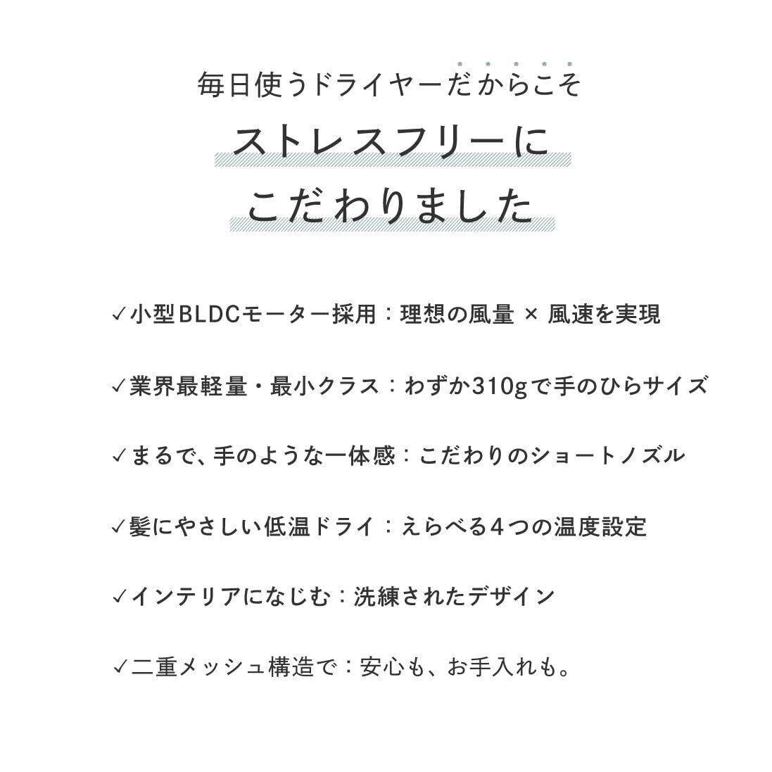 【毎日使うドライヤーだからこそストレスフリーにこだわりました-1】小型BLDCモーター採用、理想の風量×風速を実現(コンパクトなボディでも大風量と高風速を実現。頭皮にしっかり風が届くから、短時間できちんとドライ。業界最軽量・最小クラスわずか20cmの手のひらサイズで、重さはたったの310g従来のモーターの課題だった小型化が叶ったことで本体サイズもよりコンパクトで軽量になりました。まるで、手のような一体感こだわりのショートノズル。infinity-Beau?n-は、地肌などの乾きづらい部分にも風を届けやすくお子さまや女性でも疲れづらいショートノズルデザインで今までにないデザイン性とユーザビリティを両立しました。