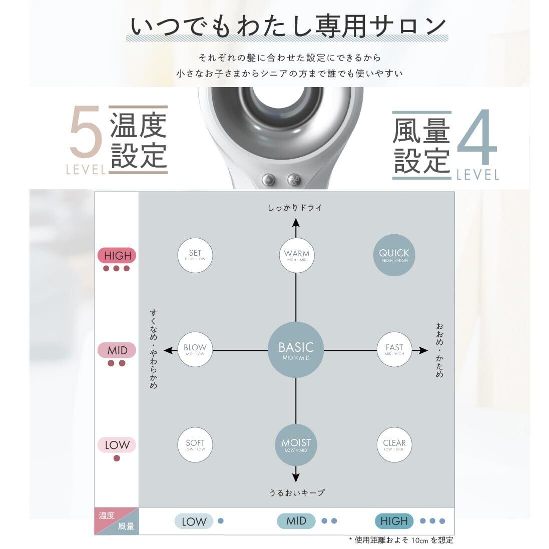 【毎日使うドライヤーだからこそストレスフリーにこだわりました-2】髪にやさしい低温ドライ、選べる4つの温度設定(低温仕様:高速風が60℃前後の温度設定できる仕様で素早く、髪を乾かし、髪に熱を当てる時間を短縮でき、髪ダメージを抑制することができます。髪質や季節に合わせて選べる4段階の温度設定でドライもブローもいつだって思いのまま。高温100度の設定できるので冬にも快適!)。インテリアになじむ洗練されたデザイン(毎日使うものだからこそ、デザイン性も重要。まるで美顔器のようなスッキリとしたフォルムと清潔感あふれるホワイト×シルバーの配色はしまっておくのがもったいないほど。大切な方へのギフトにもオススメです。)。吸込み口フィルターは二重メッシュ構造で安心も、お手入れも。