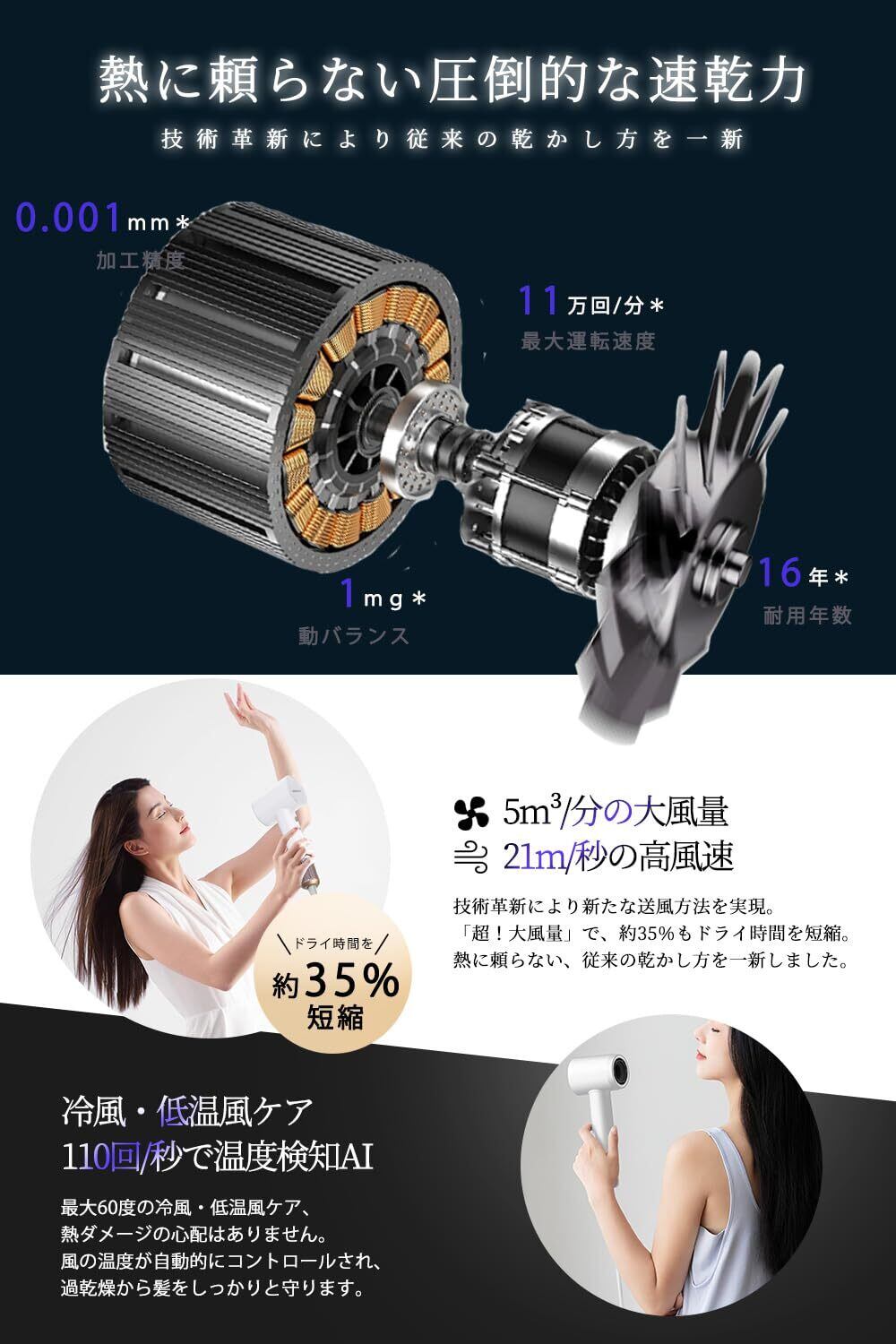 【AI温度コントロール・ダメージカット】 NTCサーモスタットを搭載し、毎秒110回の温度測定とコントロールにより、髪表面の水分を素早く取り去りながらも、過度な熱によるダメージを防ぎます。 デリケートな頭皮でも安心してご利用いただけます。