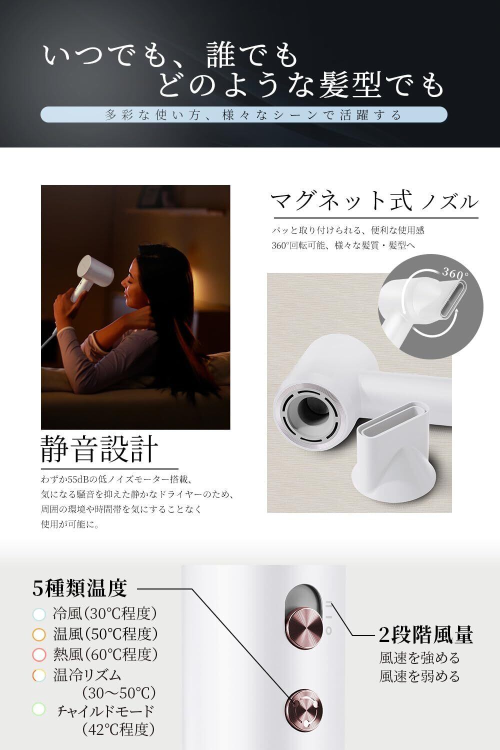 【静音設計で快適な使用感】静音機能により、使用時の音が気になることもありません。朝や夜のお手入れでも周囲を気にせず、リラックスしながら髪を乾かせます。