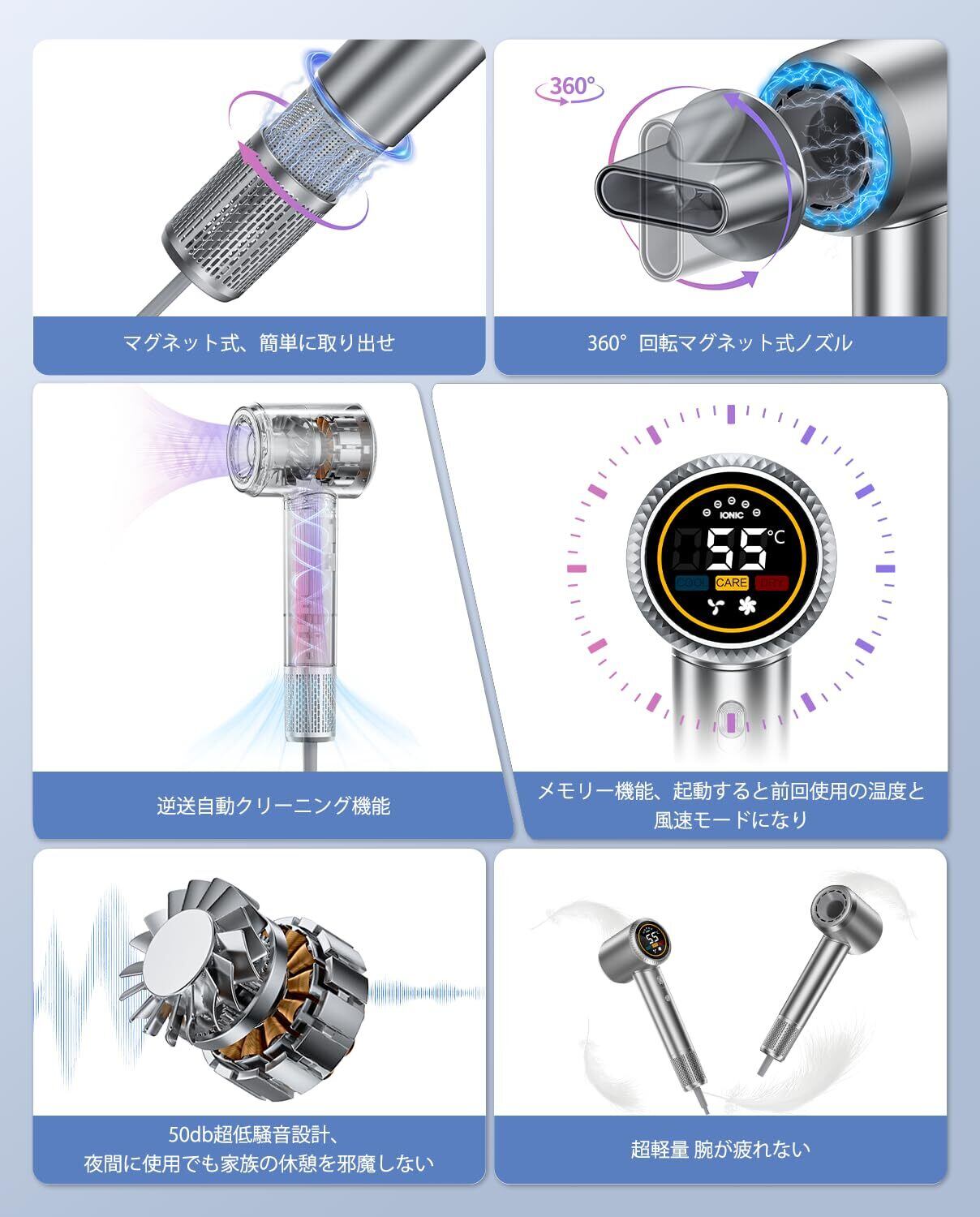 【軽量化&多機能一体型ドライヤー】本体重量はわずか365gで長時間お使いいただいても手が疲れません。「速乾・美髪・ツヤ・100%静電・ヘアケア・髪質改善」 ドライヤーに望む全ての機能を同時に実現した美髪速乾ドライヤーが誕生!更に、記憶機能と逆送自動クリーニング機能搭載しており、 驚くべき性能を誇る、次世代ドライヤーここに結実