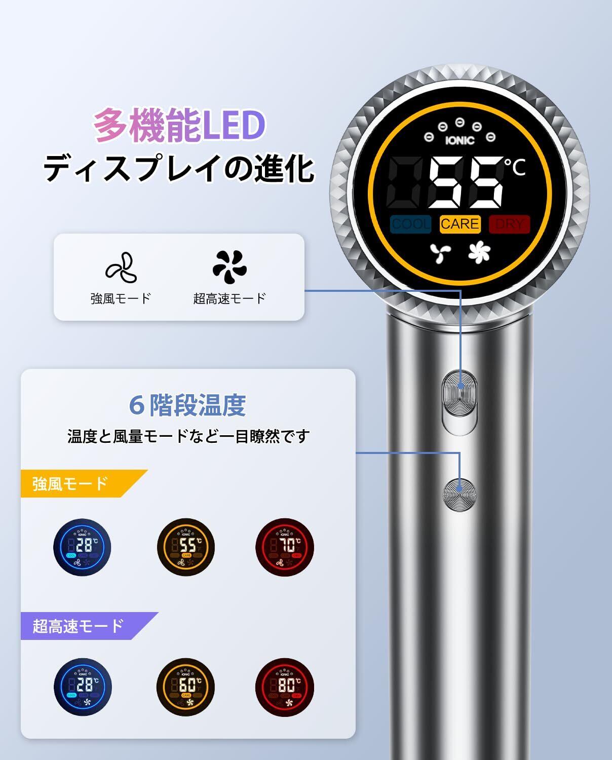 【温度の見える化&6段階温度調節で】6段階温度[28℃・55℃・60℃・70℃・80℃・温冷リズム]と2段階風速[強・超強]の組み合わせで豊富なドライモードにより、髪質やスタイリングに合わせて最適な設定が可能です。髪ダメージゼロ革命! 高精細LEDデジタルディスプレイ画面搭載ヘアドライヤーが風量&温度モードは一目瞭然です。また、NTC温度センサーが内蔵され、自動に温度を検知して、過熱自動停止、リアルタイムで風温をコントロールし温度過昇を防ぎ、安全・安心にお使いいただけます。
