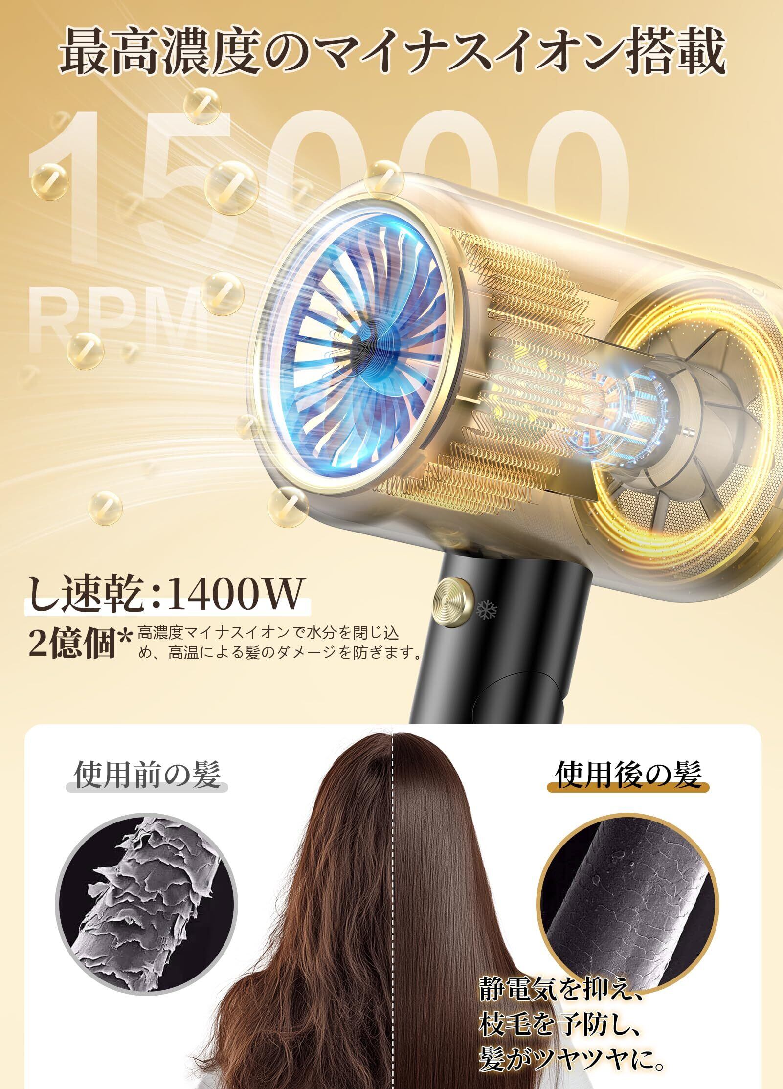 【髪質改善・マイナスイオン】あなたの髪を一日中サラサラで美しく保つ秘密が、このヘアドライヤーには内蔵されています。ヘアドライヤーは取得済みの高濃度ネガティブイオン技術を駆使し、毎回の使用で2000万個ものネガティブイオンを髪に送り込みます。これらのイオンは、髪に水分を閉じ込め、静電気を抑制し、髪の乾燥と切れ毛を防ぎます。長く使うと、髪をつややかにするだけでなく、髪の光沢感と柔らか感を向上させます。「早くて楽に、そして美しく髪を乾かしたい」というニーズを叶えたドライヤーです!