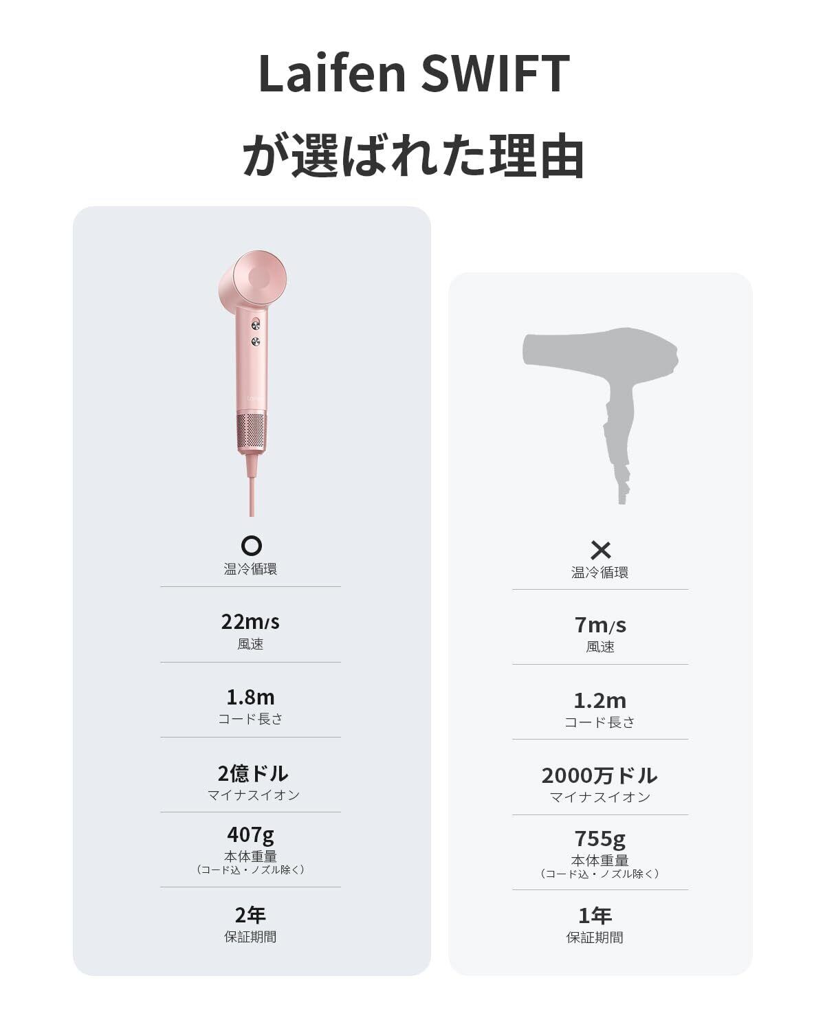Laifen ライフェン ドライヤー SWIFT 大風量 速乾 高濃度2億マイナスイオン 110,000回転/分 ヘアドライヤー 静音設計 22m/s 温風・冷風 8モード 過熱防止 軽量コンパクト 持ち運び便利 低騒音 静電気除去 マグネット式ノズル付き 家庭用/旅行用 (サクラピンク)