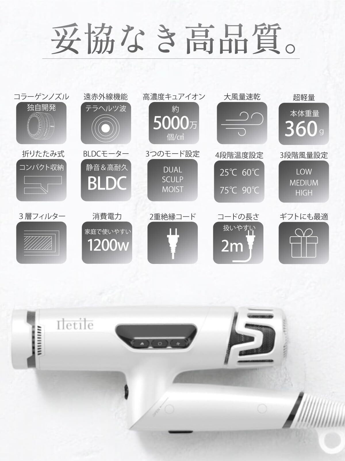 「Iletile (アイルティル) コラーゲン ドライヤー で、あなたの毎日のヘアケアをワンランクアップさせてみませんか?自分へのご褒美や、特別な方へのギフトにも喜ばれる商品ですので、ぜひご検討ください。