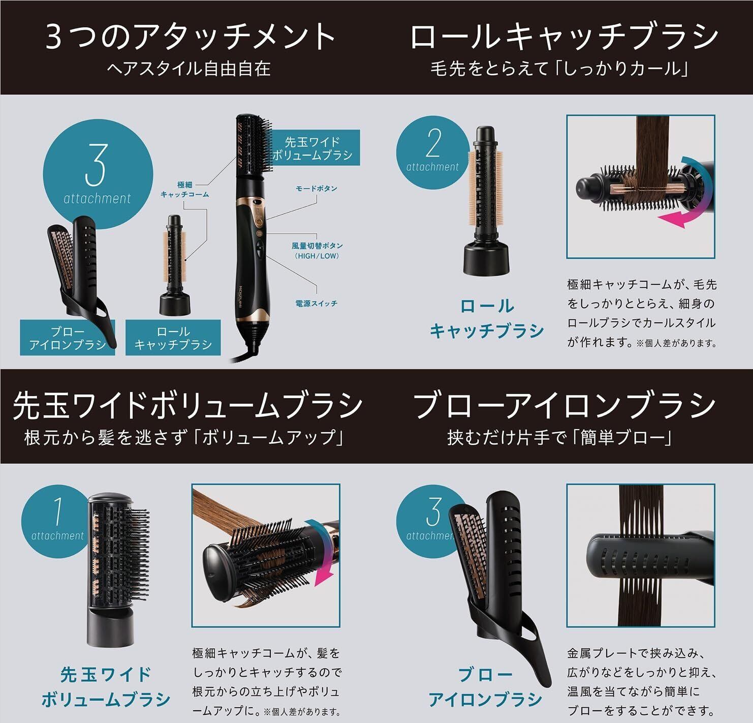 3つのアタッチメントでヘアスタイル自由自在:先玉ワイドボリュームブラシ、ロールキャッチブラシ、ブローアイロンブラシ