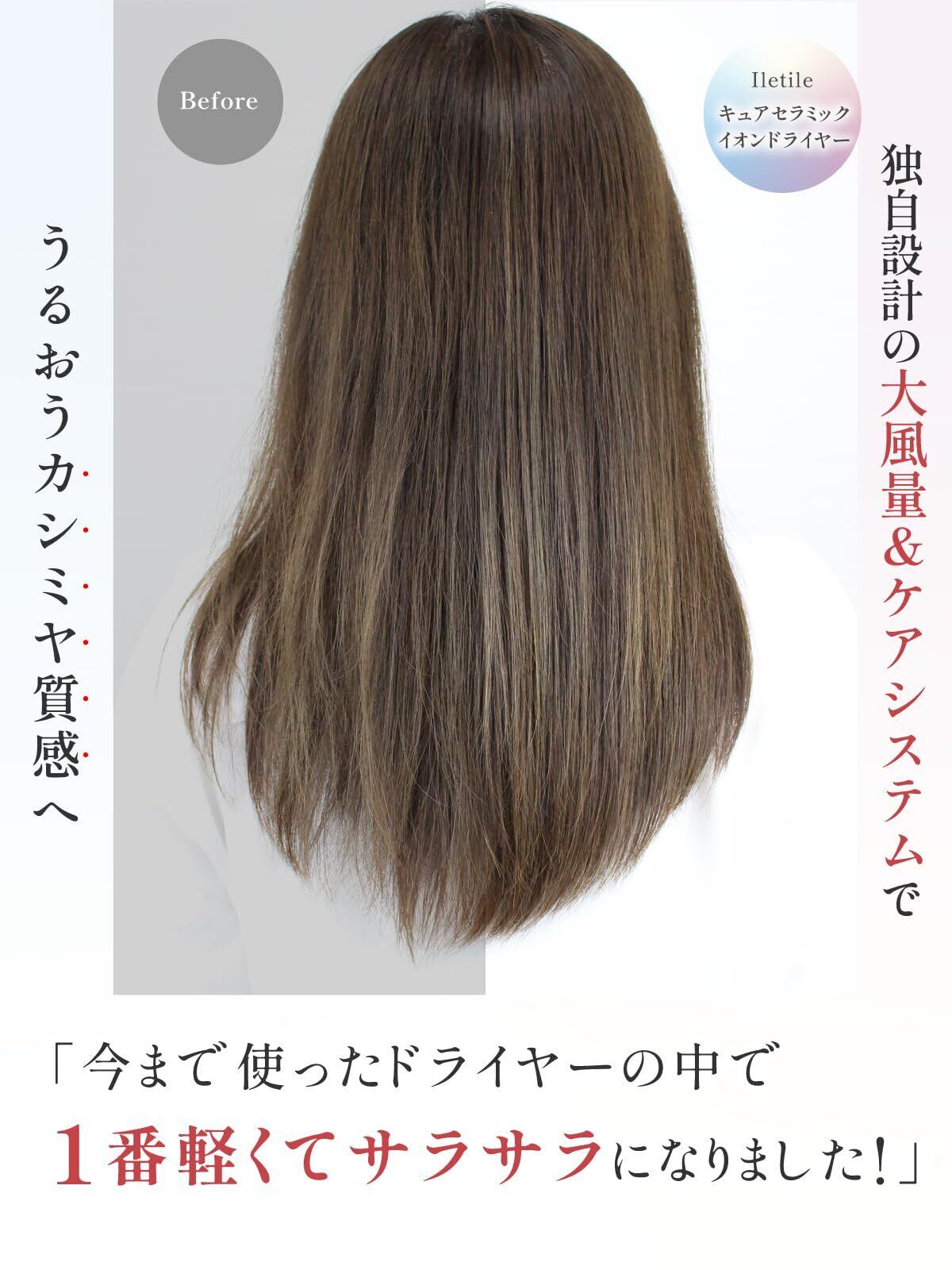 【ツヤ、うるおいUPキュアイオン】Iletile独自のキュアイオンを搭載。ドライヤー内部で約1億3000万個以上のマイナスイオンを生成し最大5000万個以上を放出。髪に潤いと艶を与えダメージを軽減します。