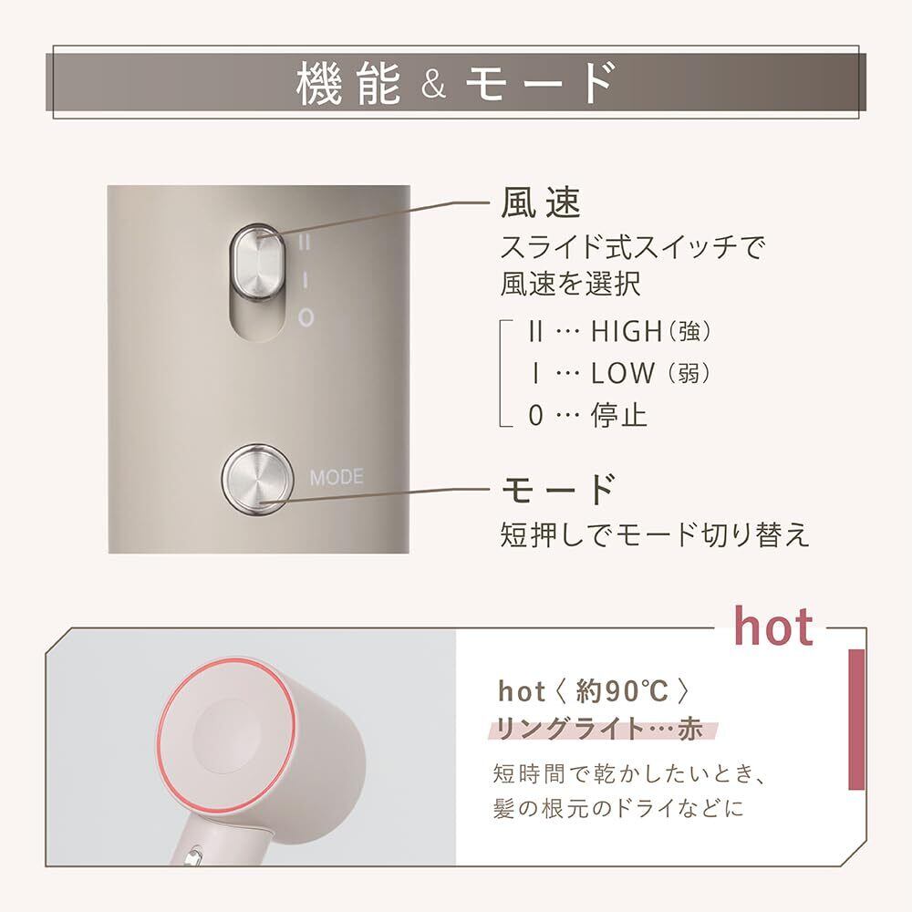 ️【速乾・静音・大風量】風速(high/low)、温度モード(hot/warm/cool/mix)の合計8タイプ切り替えにより自分の髪質に合ったヘアケアが可能に。また、BLDCモーター搭載で高効率・長寿命・静音を実現。そしてモード記憶も搭載しており、いつものケアをすぐに再現できます。大風量ながらも柔らかい風当たりで、素早く髪を乾かせます。