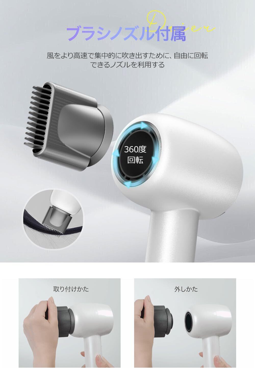特徴 イオンテクノロジー, コンパクト, 低ノイズ, 軽量, 速乾
