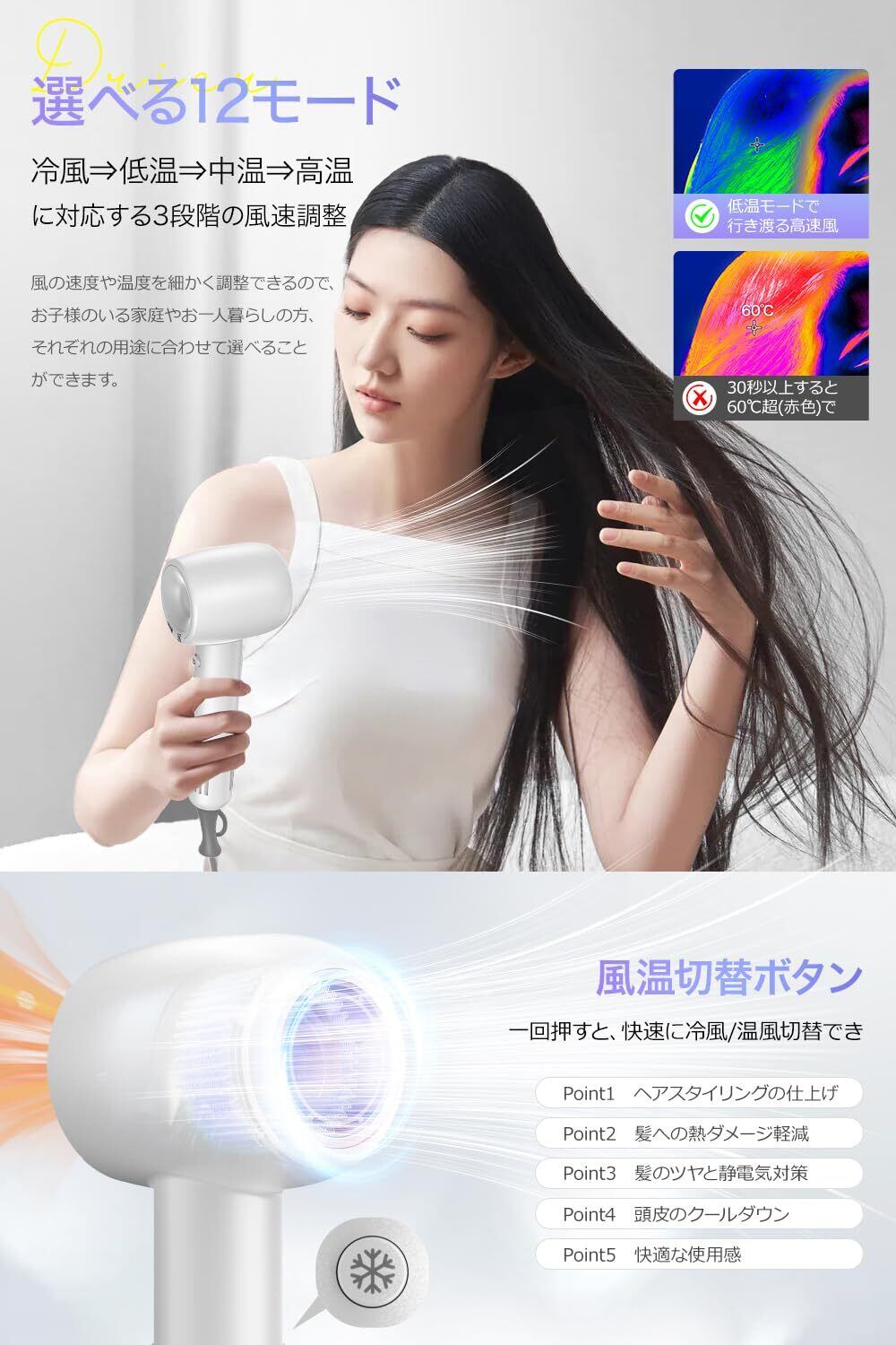 【12種類のモードニーズに精密にマッチ】 ドライヤーは3段階の送風量(強風、中風、弱風)と4段階の温度(冷風、低温、中温、温風)調節が可能で、独立した冷風ボタンも備えています。合わせて12種類の異なるモードを組み合わせることができます。個人の髪質とヘアスタイルのニーズに応じて、最適な設定を精度よく選択することができます。雨の多い季節でも、日常のヘアケアでも、驚異的なスピードで髪を乾かし、迅速に型を整えることができます。時間を節約し、ヘアスタイリングのプロセスをより簡単にします。