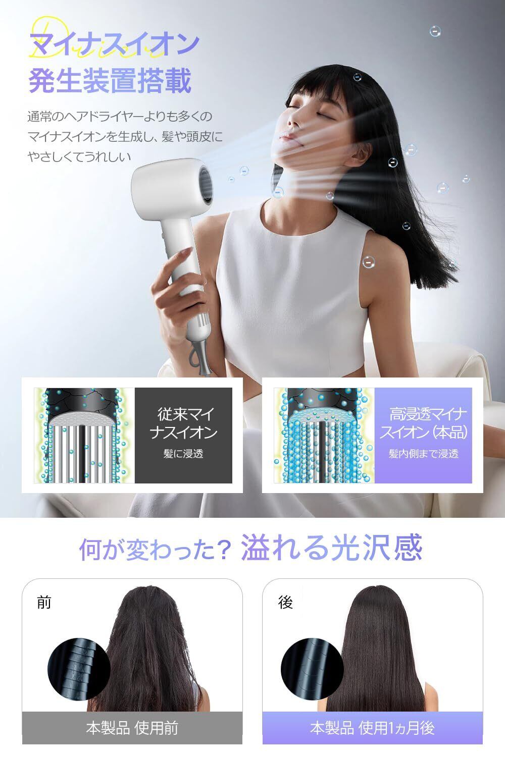 【高濃度マイナスイオンで潤い維持】このドライヤーは、高濃度のマイナスイオンを放出し、髪のパサつきや静電気を抑える効果があります。光沢のあるしなやかな髪を実現し、質感の向上が期待できます。