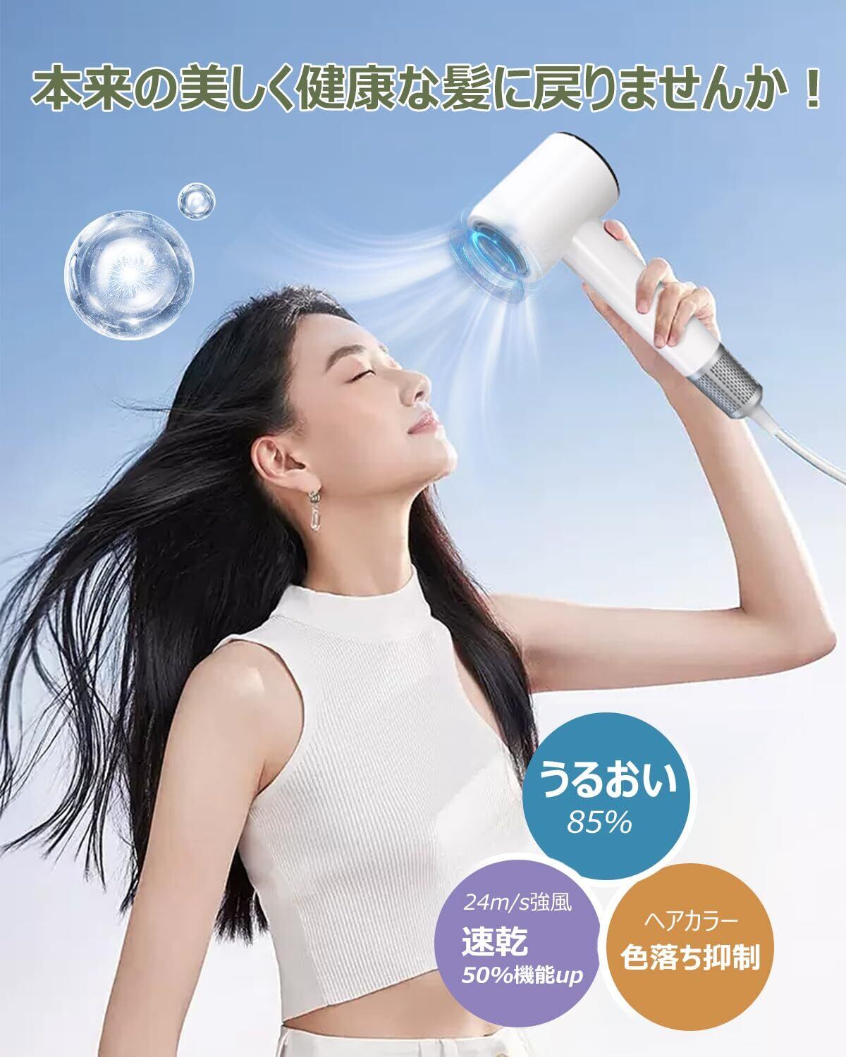 ■2億マイナスイオンで髪を守る!■内蔵された高濃度マイナスイオン発生器が、特に乾燥しがちな髪に潤いを与え、静電気を抑制。髪表面の水分を保ちながら乾かすことで、しなやかで輝く美しい髪を実現します。