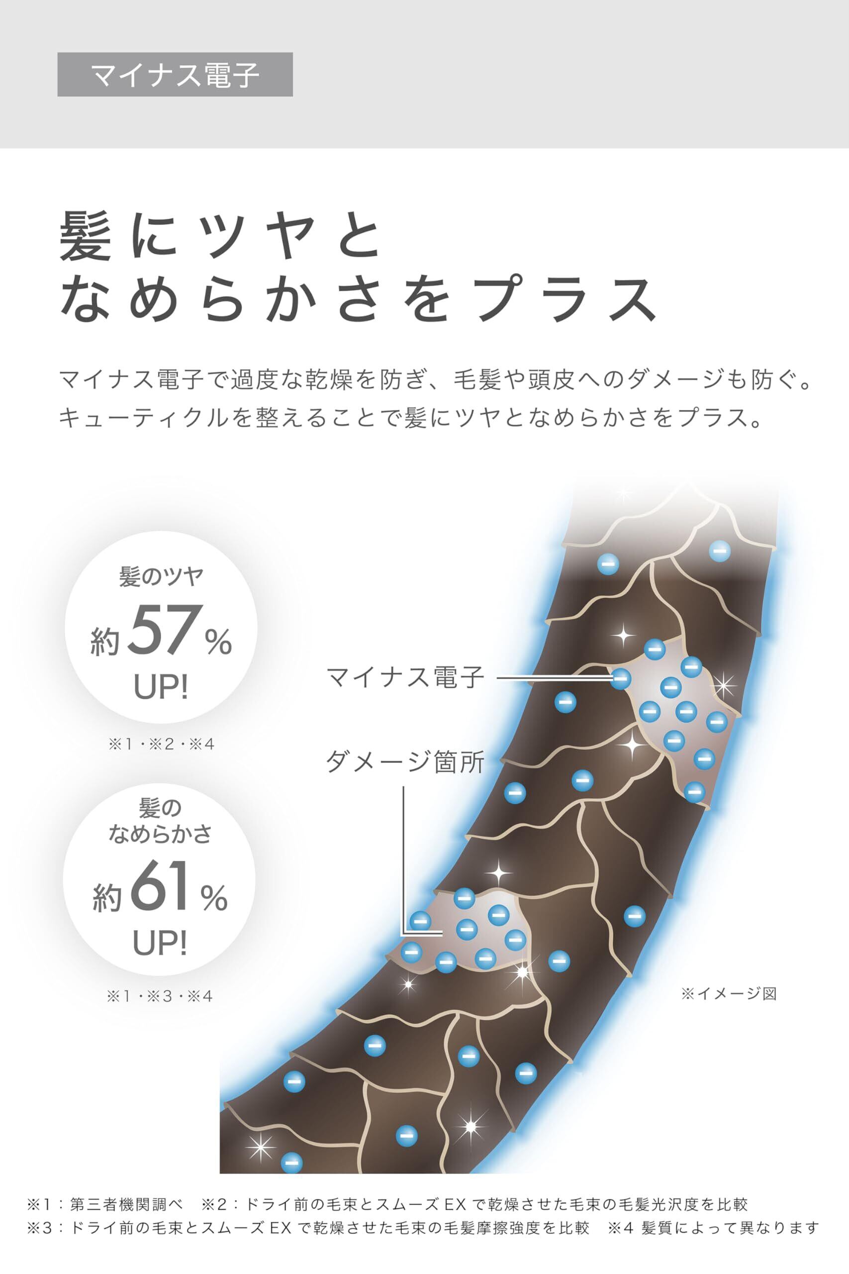 【髪に優しい設計】スムーズEXフィルターによって、髪に必要な水分をしっかりと保持し、パサつきを防ぎます。マイナスイオン効果も得られ、髪のダメージを軽減しながらつやのある美しい仕上がりを叶えます。