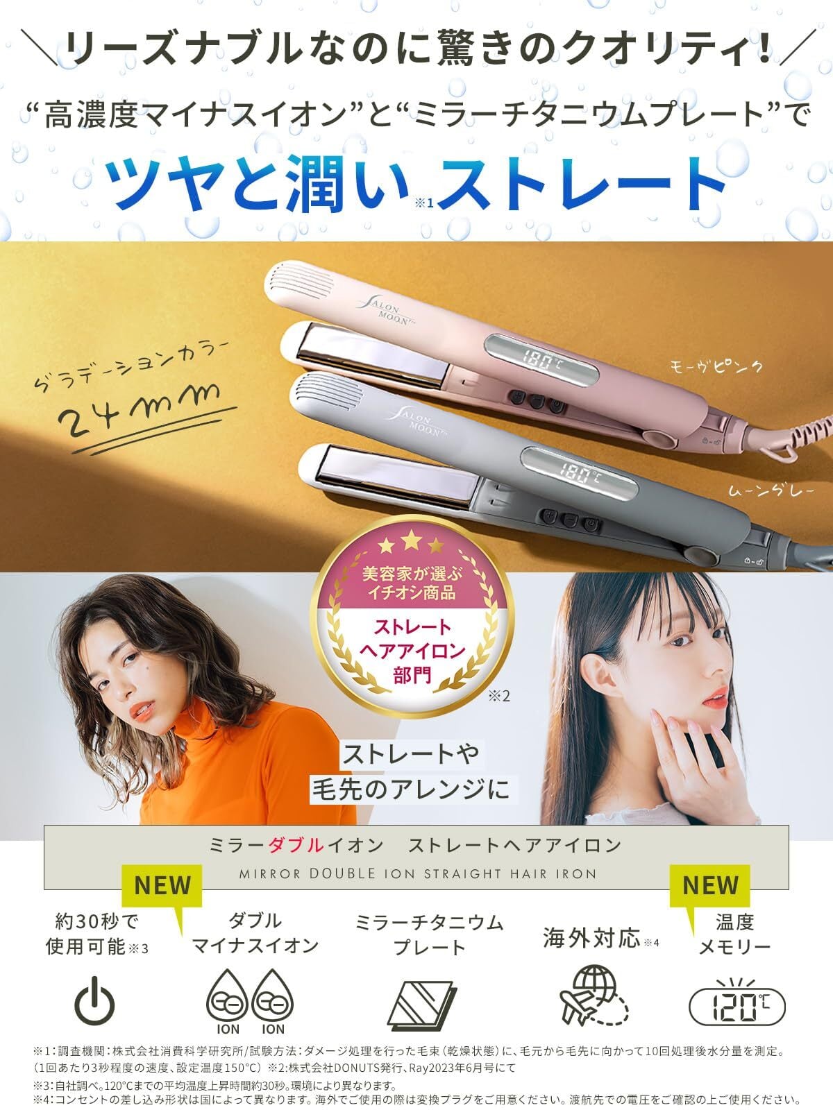 ◆デジタル表示 秒速スタンバイ SALONMOON (サロンムーン) ミラーダブルイオン ストレート ヘアアイロン 24mm ムーングレー ストレートアイロン 80℃~230℃ カール 2WAY コテ 高濃度マイナスイオン 海外対応◆