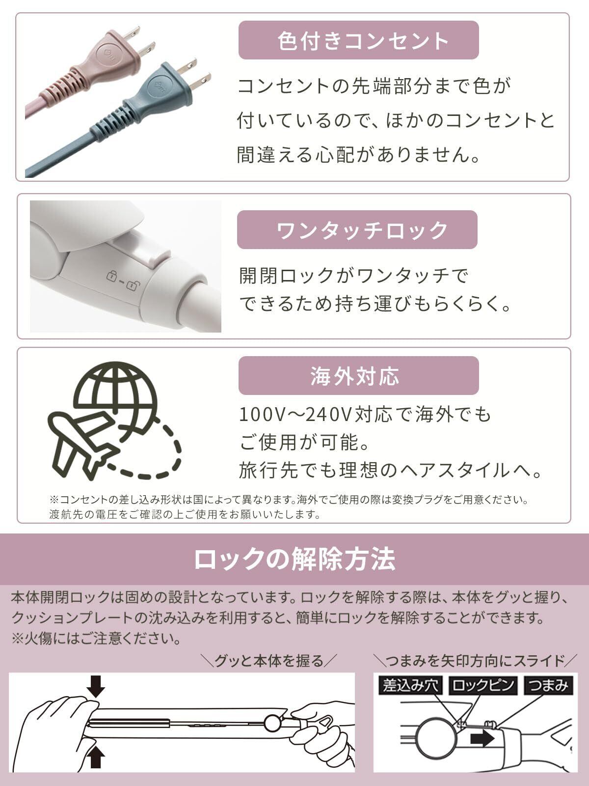 【 30段階 温度設定 】80℃~230℃まで5℃間隔で30段階の設定が可能。スピードヒーター搭載で忙しい朝でもあっという間に使用可能温度に到達します。温度上昇確認モニターで1℃ずつ温度上昇を確認できて便利! サロン用 として プロ の 美容師 さんにも 人気 です。 【 海外対応 】100V~240Vまで対応しているので、海外 でも使用できます。※変換プラグはご用意ください。【 持ち運び にも】ロック機能搭載で コンパクト に 収納 ができます。旅行 などの持ち運び にも便利です。