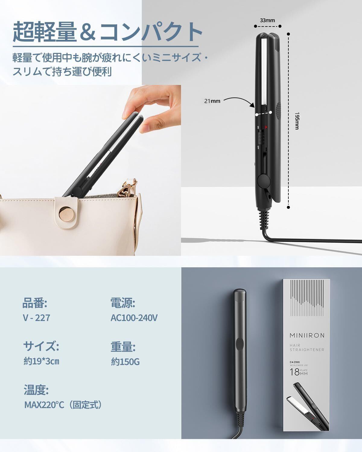 【MAX220℃&海外対応】:温度値が最大220℃、電源を入れてから約60秒で使用可能な温度に到達し、スタイリング時間の短縮につながります。また、100V~240Vの電圧に対応可能なので、海外への旅行や出張にも適用。要注意:海外で使用の際は国や地域に合わせた変換プラグをご用意ください。