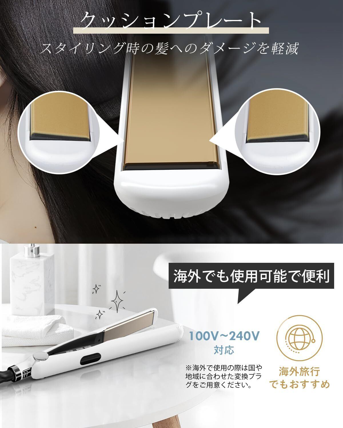 商品特長 ストレート・カール両用、100℃〜230℃の14段階温度調節可能、海外対応、温度表示ディスプレイ付き、クッションプレート、360度回転コード、自動電源OFF機能付き、アイロン部を閉じた状態でロック可能