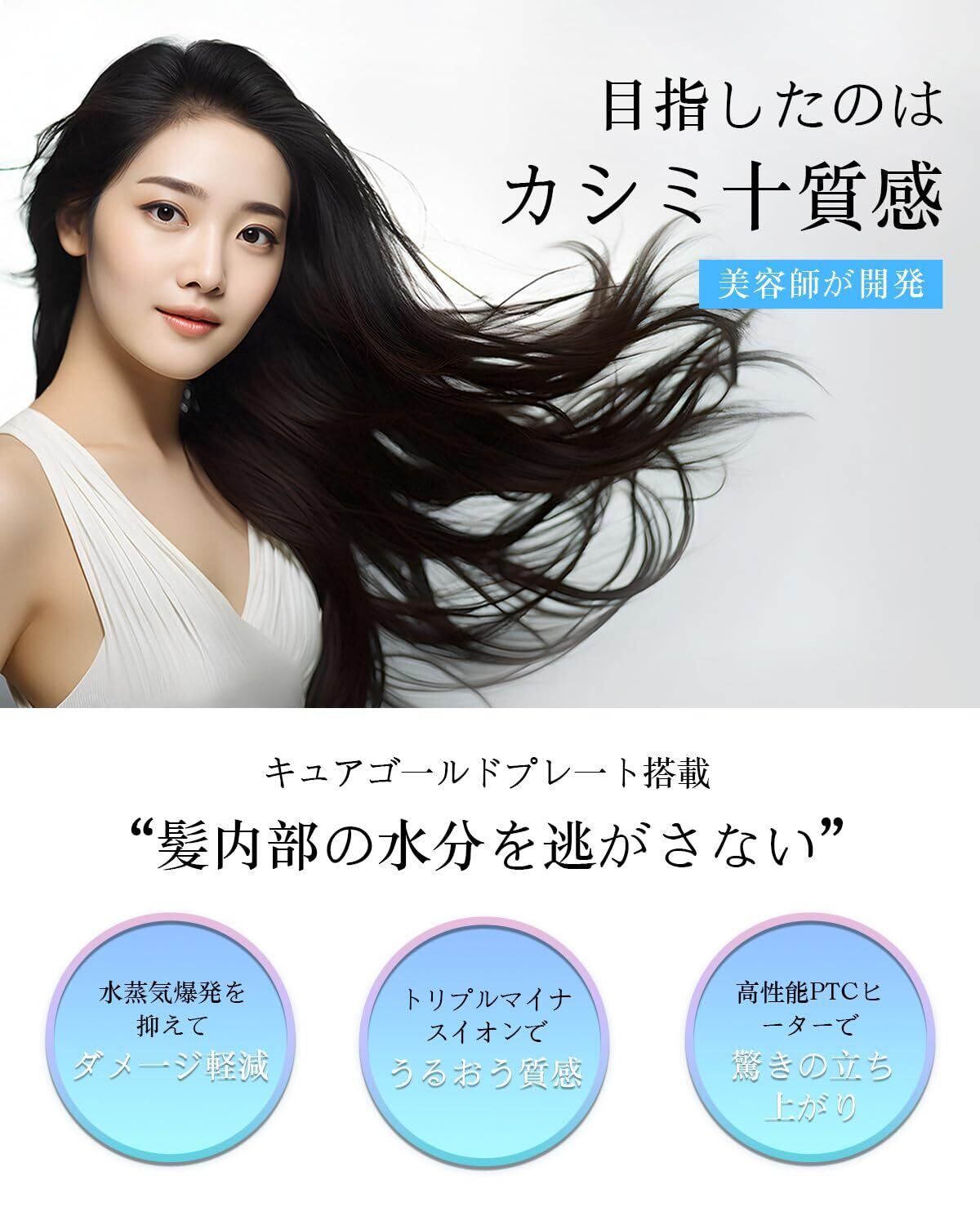 【髪に優しいマイナスイオン技術!】マイナスイオンによる潤いを髪に与え、静電気を軽減。艶やかで滑らかな仕上がりをサポートします。熱によるダメージを抑えつつ、美しいスタイリングが実現します。