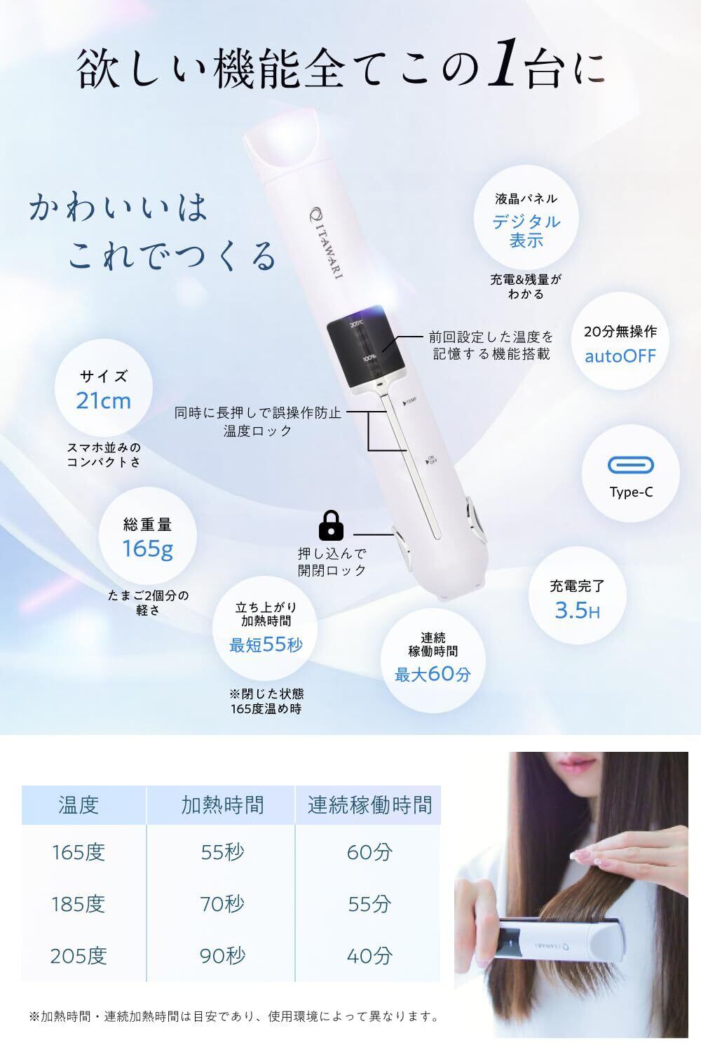 【速く軽い、どこでもサロン品質】セラミックプレートで均一に速く熱を作り出し時間がない場面でも活躍する最短55秒の立ち上がりの速さ。持ち歩きに最適な500mlペットボトルと同等の長さ21cm・およそ卵2つ分の重さ165gでコンパクト軽量モデル。耐熱性、断熱性に優れたケース付きで使用後冷まさず収納可能。