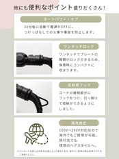 【 ダイヤル式温度設定 】120℃~230℃までダイヤル式で設定が可能。簡単操作で 初心者 の方にも◎スピードヒーター搭載で忙しい朝でもあっという間に使用可能温度に到達します。 サロン用 として プロ の 美容師 さんにも 人気 です。 【 海外対応 】100V~240Vまで対応しているので、海外 でも使用できます。※変換プラグはご用意ください。【 持ち運び にも】ロック機能搭載で コンパクト に 収納 ができます。旅行 などの持ち運び にも便利です。