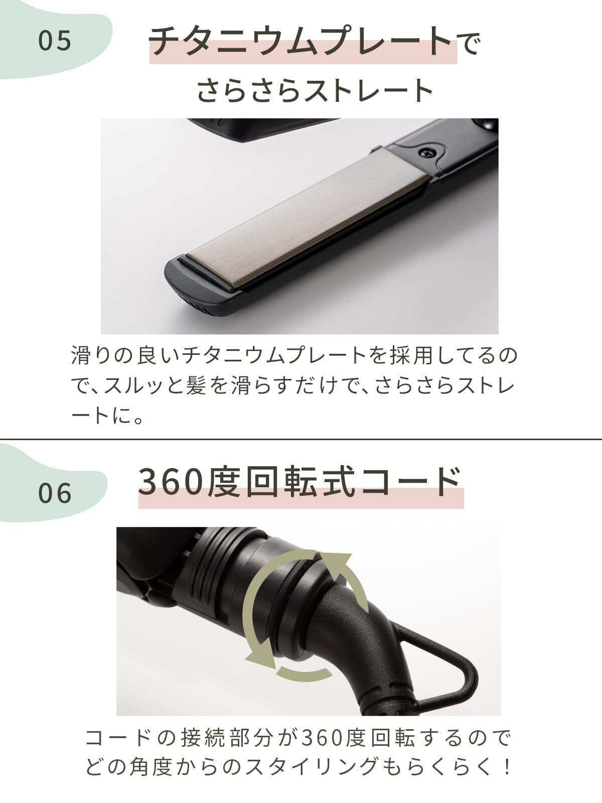 【チタンプレートの高性能!】洗練されたチタンプレートは、優れた熱伝導率を誇り、髪全体に均一に熱を届けます。さらに、マイナスイオンを発生させることで髪の静電気を抑え、艶やかな仕上がりをサポートします。使うたびに髪が美しくなる感覚を体感してください。